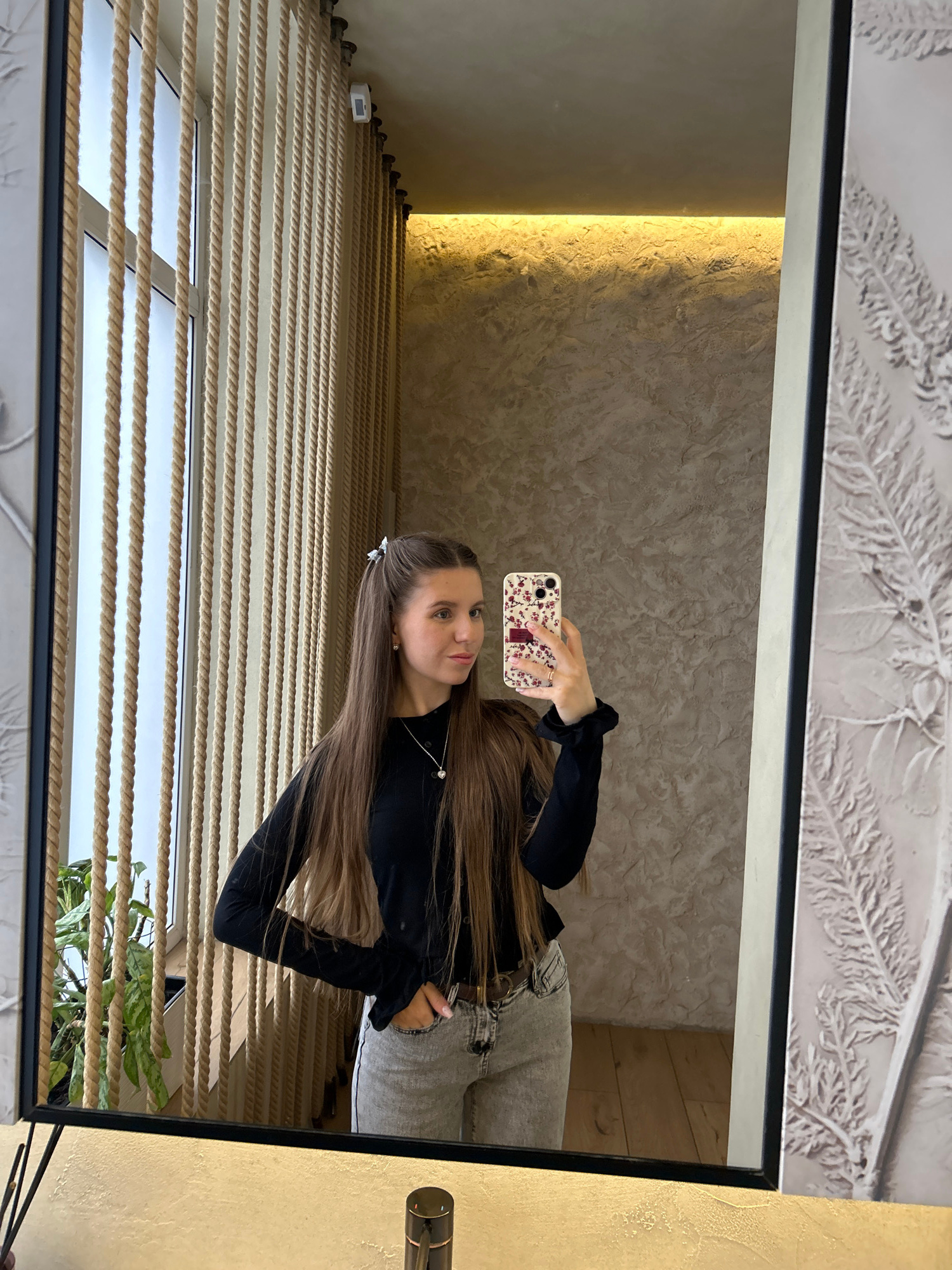 A young woman is depicted taking a mirror selfie in an indoor setting. She stands upright, holding a smartphone with a white and red floral case in her right hand, aiming it towards herself in the mir…read more