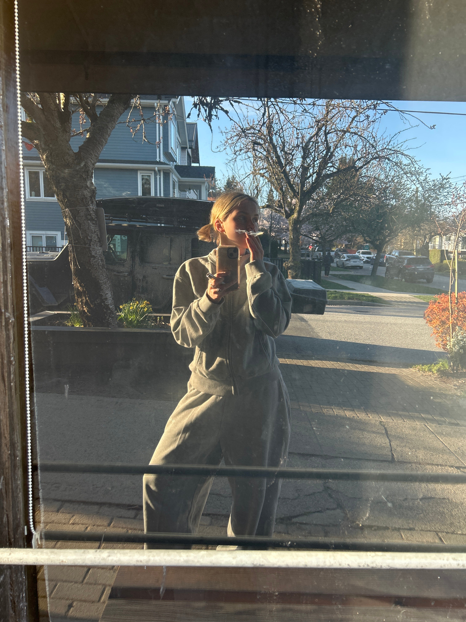 A young person is visible in a reflection through a window, holding a phone, possibly taking a selfie. The person is wearing a khaki-colored jumpsuit. The reflection also shows a street scene with hou…read more