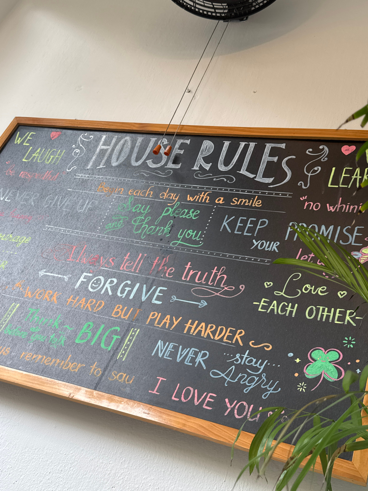 A framed chalkboard sign displaying "House Rules" in colorful chalk lettering hangs on a white wall. The sign features several rules, including "We Laugh," "Begin each day with a smile," "Keep your pr…read more