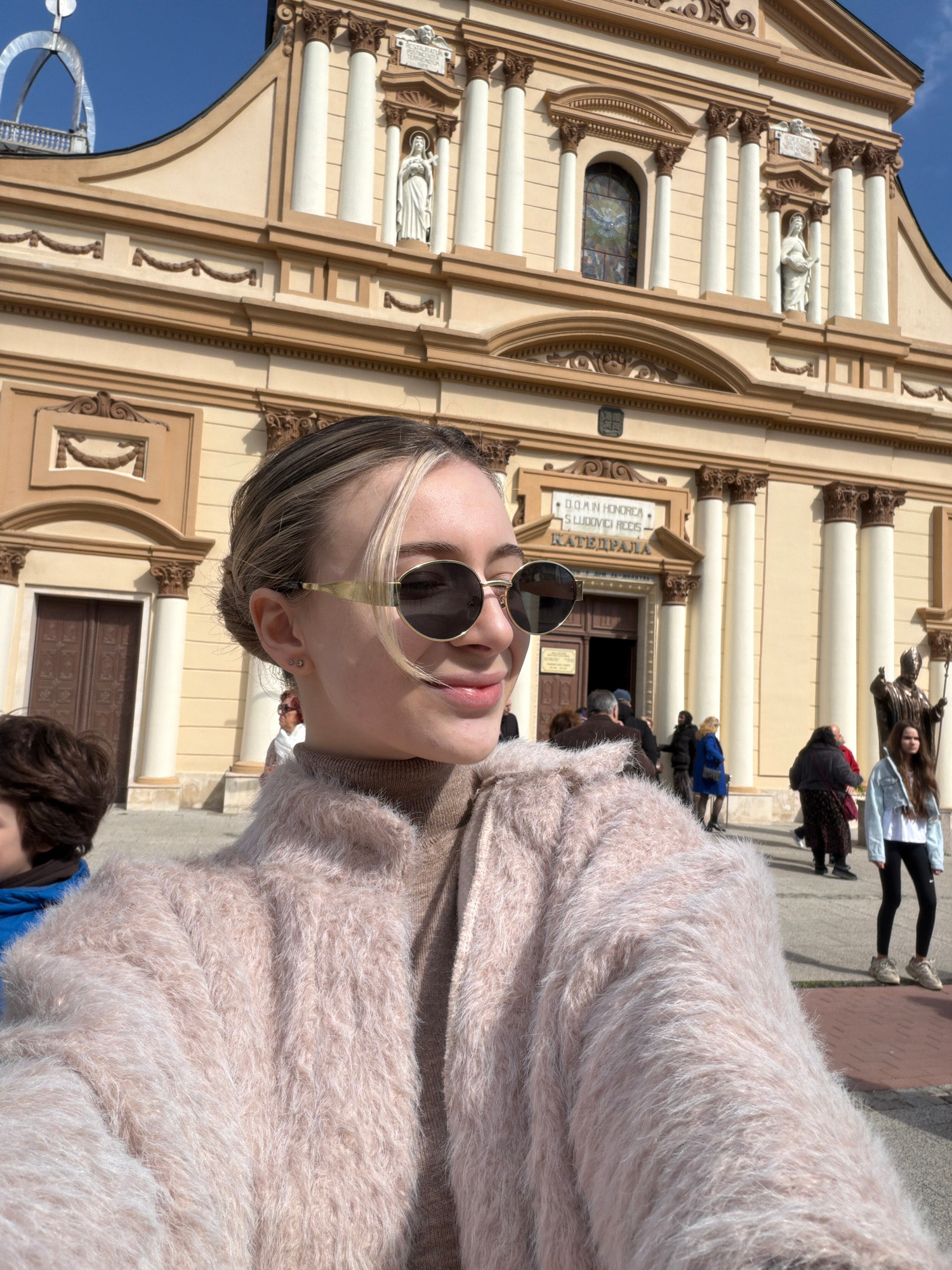 A woman wearing round sunglasses and a fuzzy pink coat stands in front of the Cathedral of St. Louis in Plovdiv, Bulgaria. The cream-colored facade of the cathedral features classical architectural elโฆread more