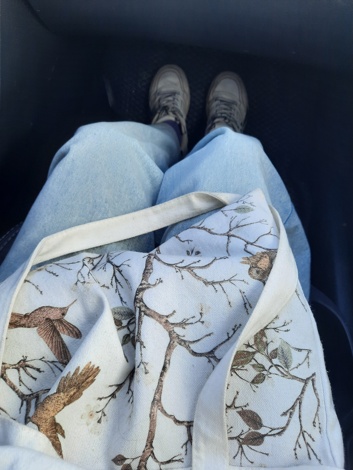 A photograph shows a person sitting in what appears to be a vehicle, with a view focused downwards from their perspective. The person is wearing light blue jeans and grey running shoes. A white tote b…read more