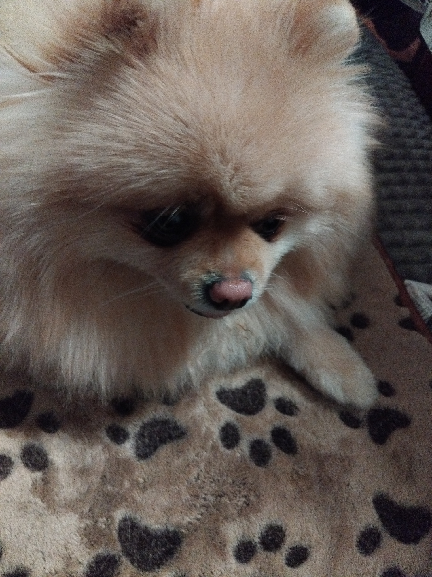 A close-up shot shows a light-colored Pomeranian dog lying on a patterned blanket or rug. The dog is positioned towards the left side of the frame with its head facing slightly upwards. Its eyes are partially closed or squinting, and its pink tongue is slightly visible at the tip of its nose. The fur is long and fluffy, with a slight variation in color around the ears. The blanket has dark brown or black paw print patterns scattered across its tan background. The exact location in the city of Apriltsi, Bulgaria is indeterminable from the image. | Open Wire