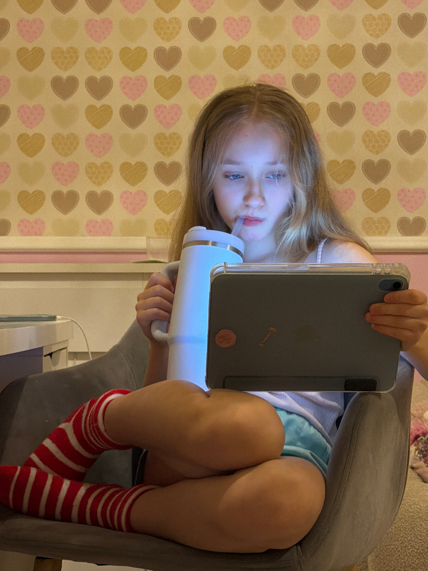 The image captures a young girl engaged in a casual indoor activity. She has long, light brown or blonde hair and blue eyes, and is looking directly towards the viewer with a somewhat neutral or conte…read more