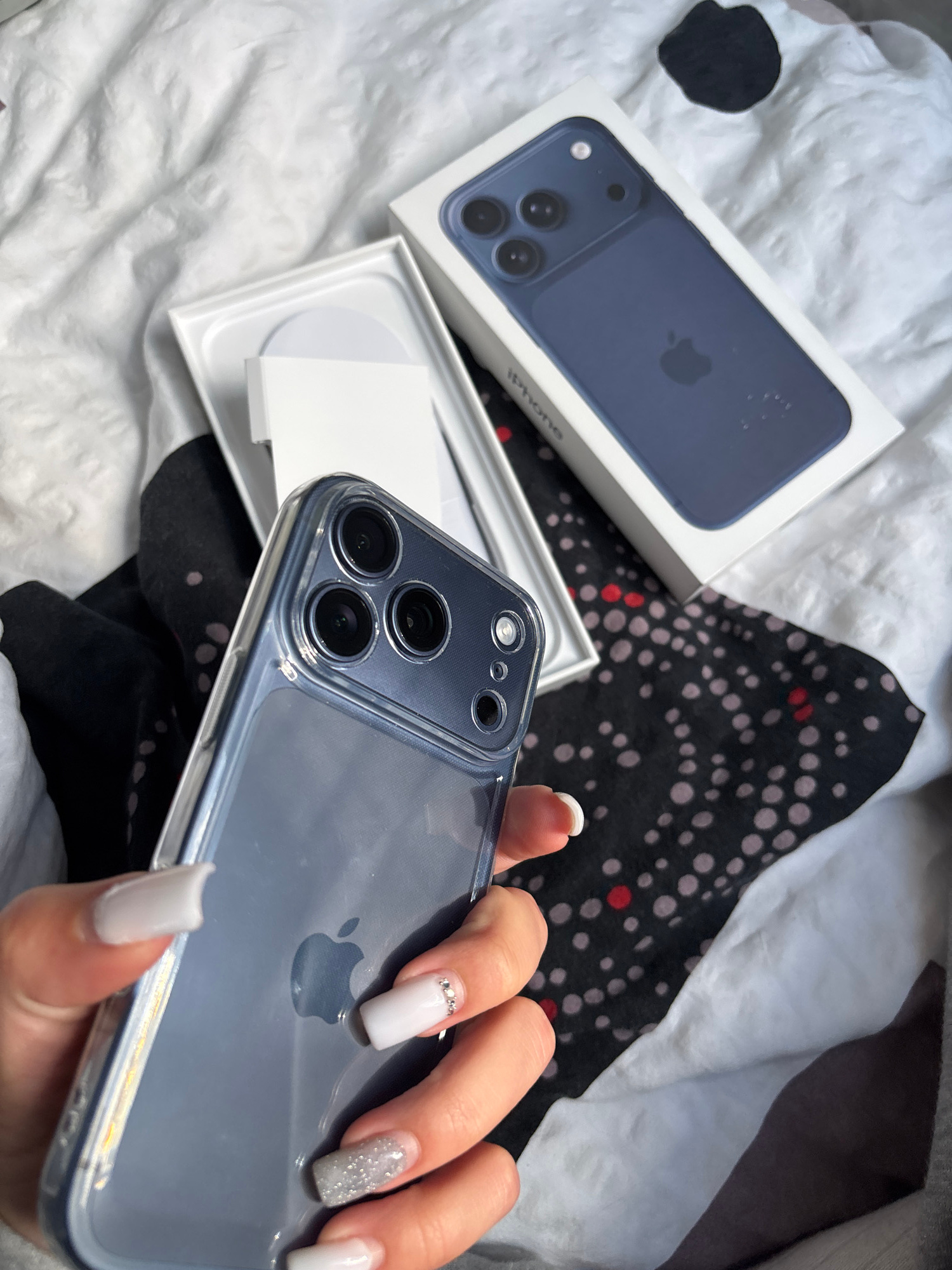 A hand is holding a blue iPhone in a clear case, with its original box placed on a patterned fabric. The environment is a bedroom. No evidence suggests that the image was taken in Gabrovo, Bulgaria.