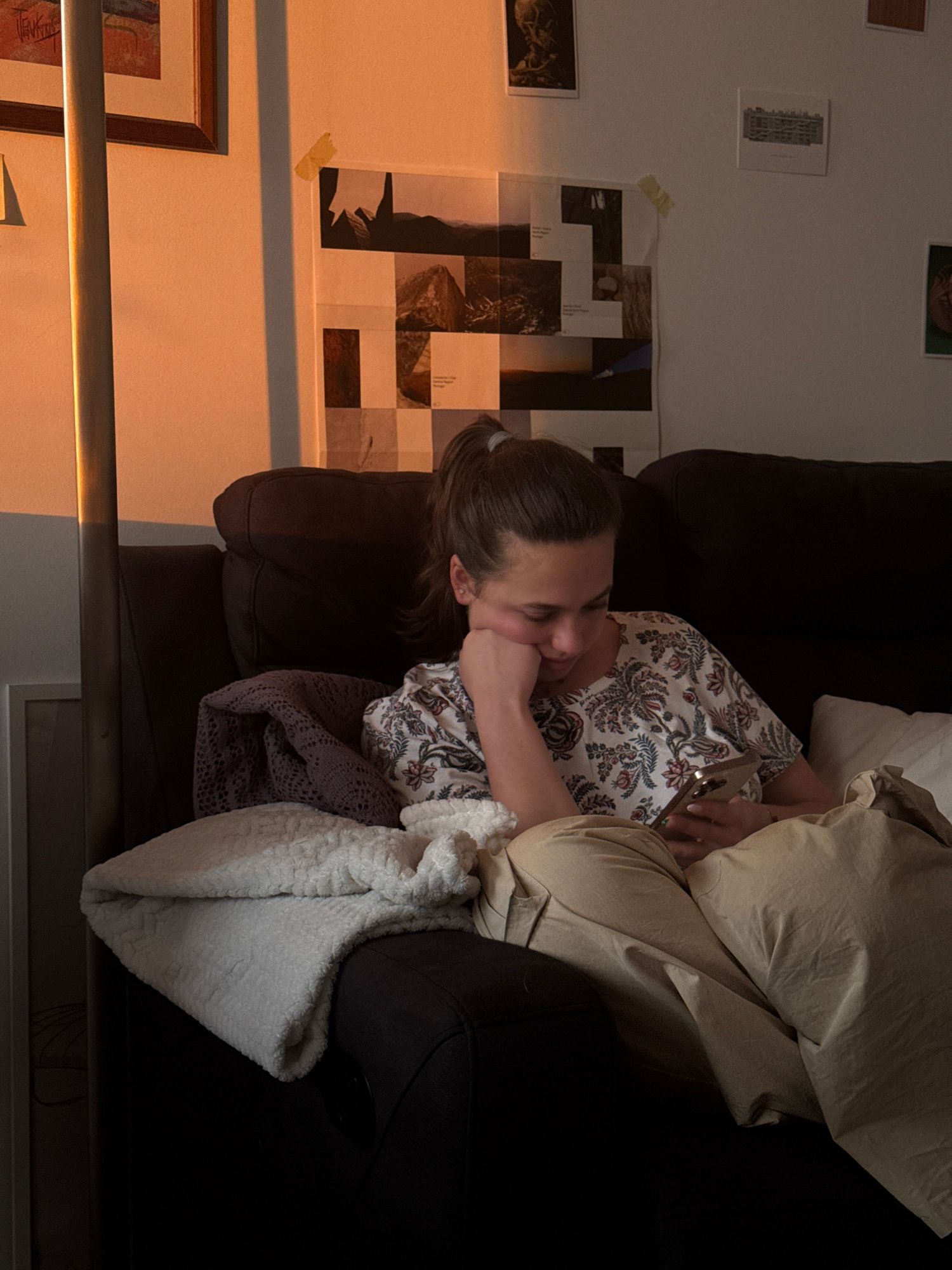 A young person with brown hair pulled back in a ponytail is lying on a dark brown sofa. They are wearing a floral print shirt and tan pants. They are resting their face in their hand and holding a celโฆread more