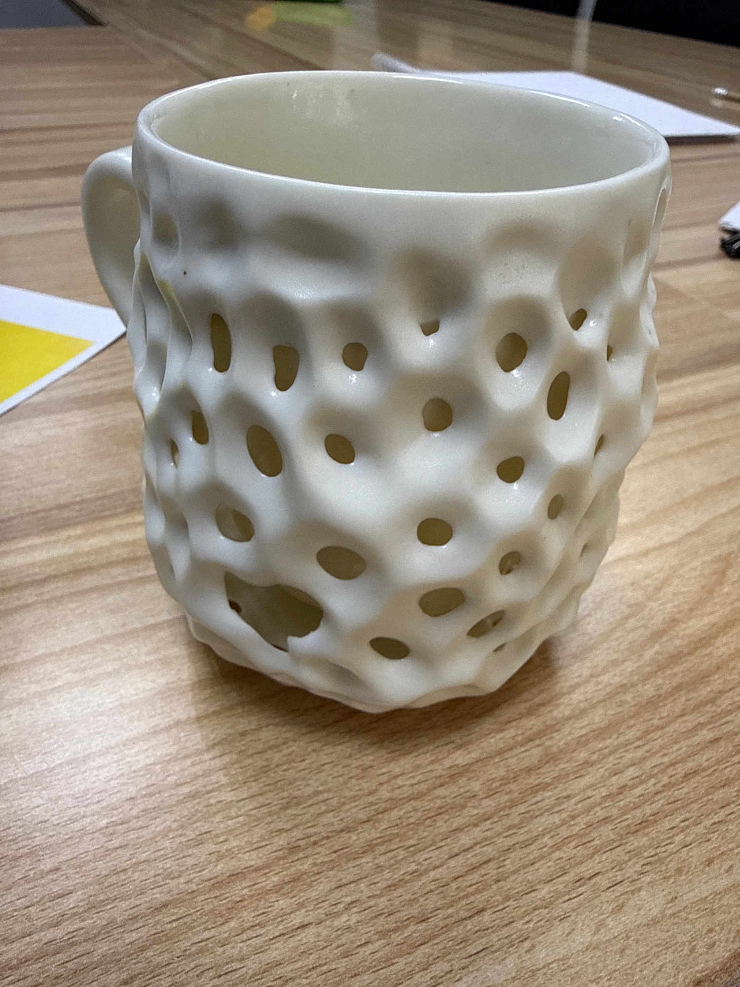 A light-colored, porous ceramic mug with rounded holes is positioned on a light brown wooden surface with a linear grain pattern. The mug is oriented at an angle, showing its interior and a small hand…read more