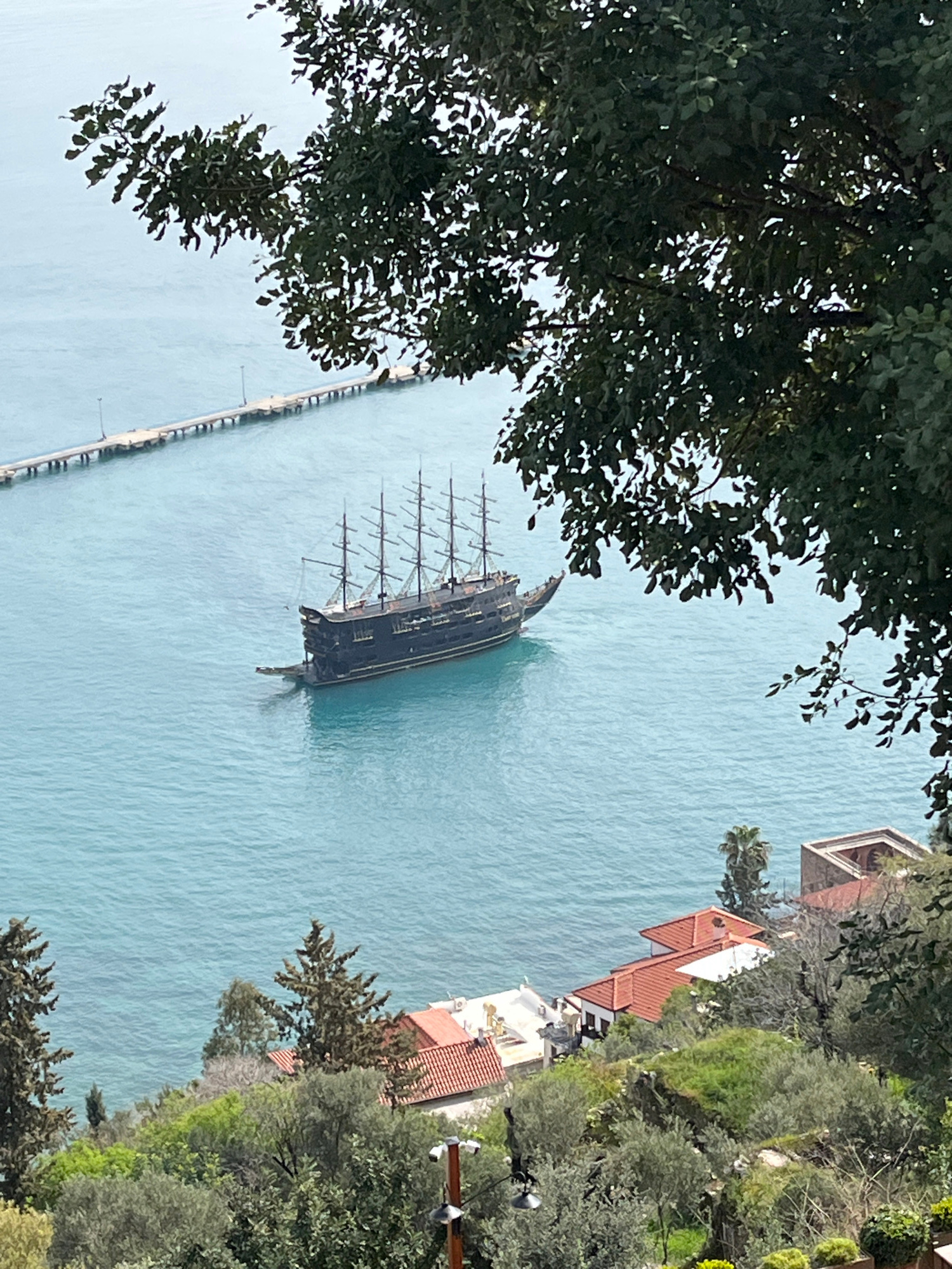 The image displays an elevated, downward-looking view of the coastal area in Alanya, Turkey, likely captured from a hillside overlooking the harbor. The central subject is a dark-hulled, multi-masted…read more