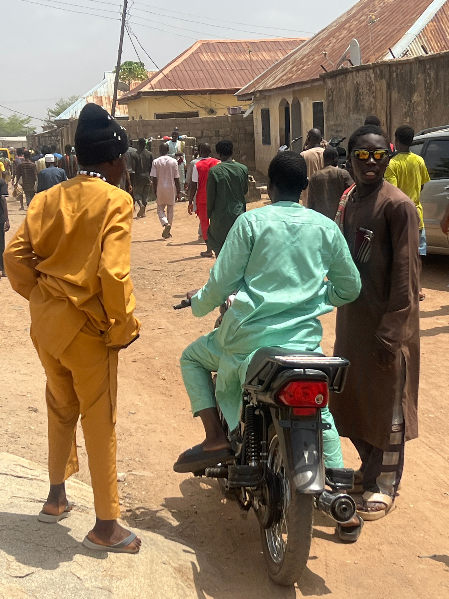 The image captures a vibrant, sunlit street scene in Minna, Nigeria, likely during the day, indicated by the bright light and strong shadows. In the immediate foreground, a person is seen from behind…read more