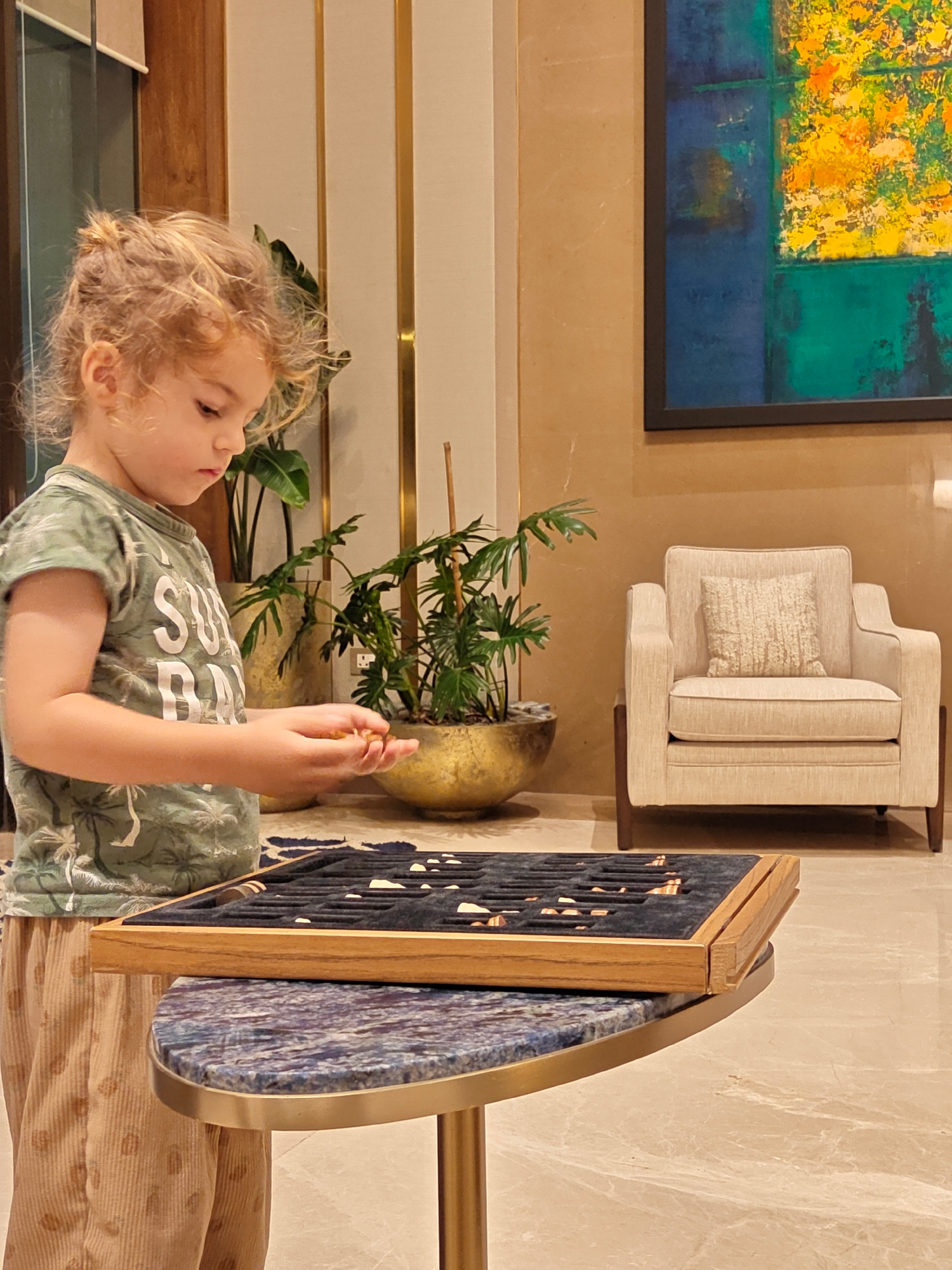 A young child with light-colored curly hair, dressed in a green t-shirt and patterned pants, stands next to a small, round table with a blue and gray patterned top and a gold-colored metal base. The t…read more