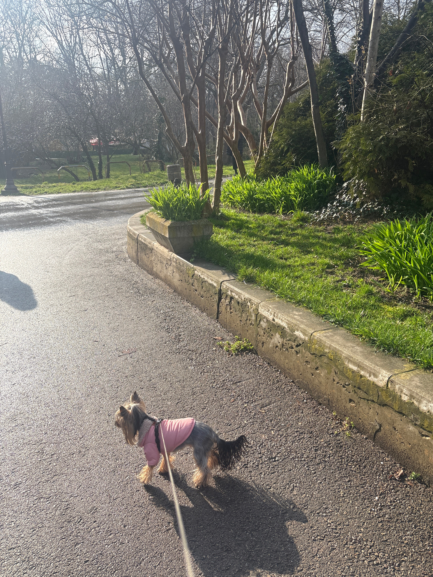 The image captures a street scene in Varna, Bulgaria. The focus is a small, terrier-type dog wearing a pink coat, walking on a paved path or road. The dog is on a leash, held by someone out of frame,…read more