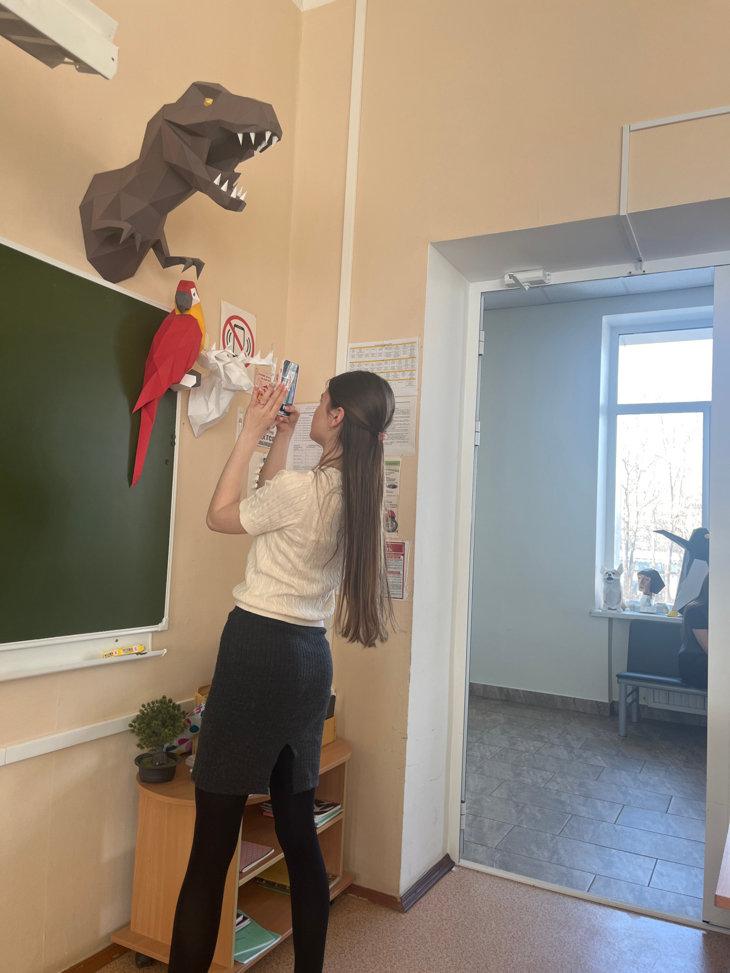 A young woman with long, dark brown hair, wearing a light-colored textured top, a dark grey skirt, and black tights, stands in what appears to be a classroom or educational facility in Chaikovsky, Rus…read more