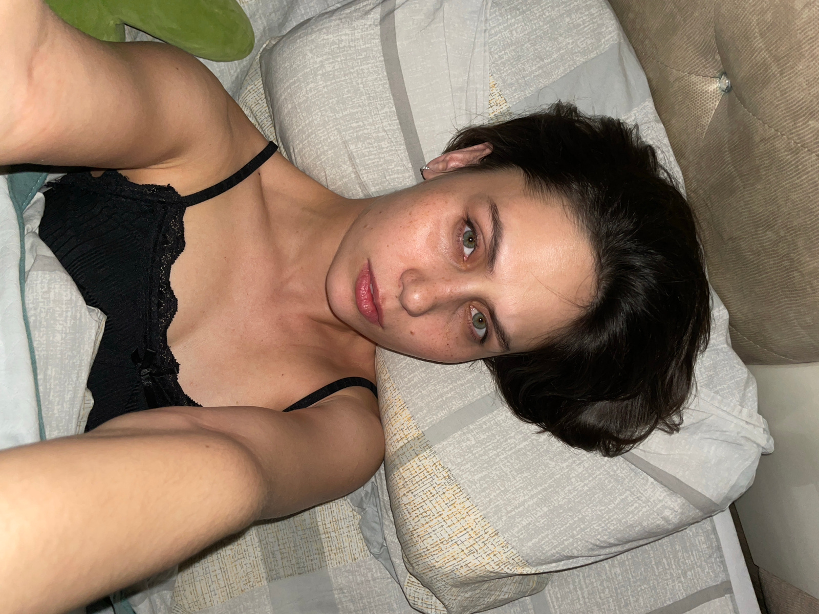 A woman lies on a pillow with a patterned cover. She has dark hair pulled back, fair skin, and visible freckles on her face. She wears a black lace top with thin straps. Her head is turned slightly to…read more