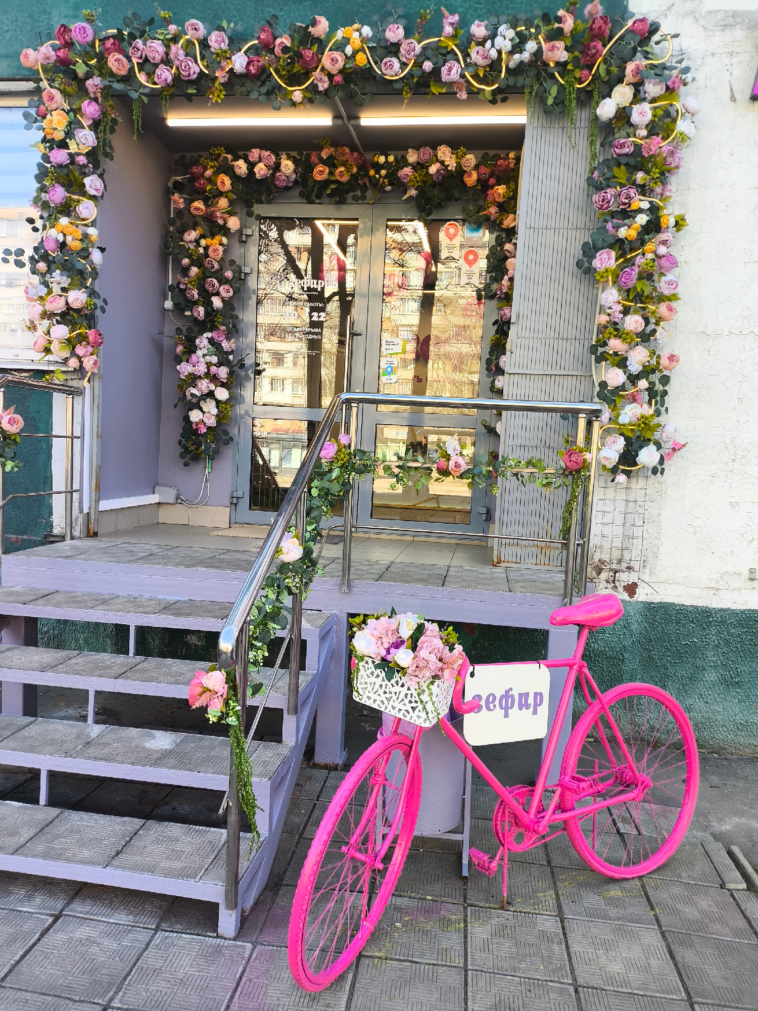 The image shows a retail location in Khimki, Russia. The storefront is decorated with an archway of artificial flowers above the entrance and along the edges. The entrance has double glass doors. A pi…read more