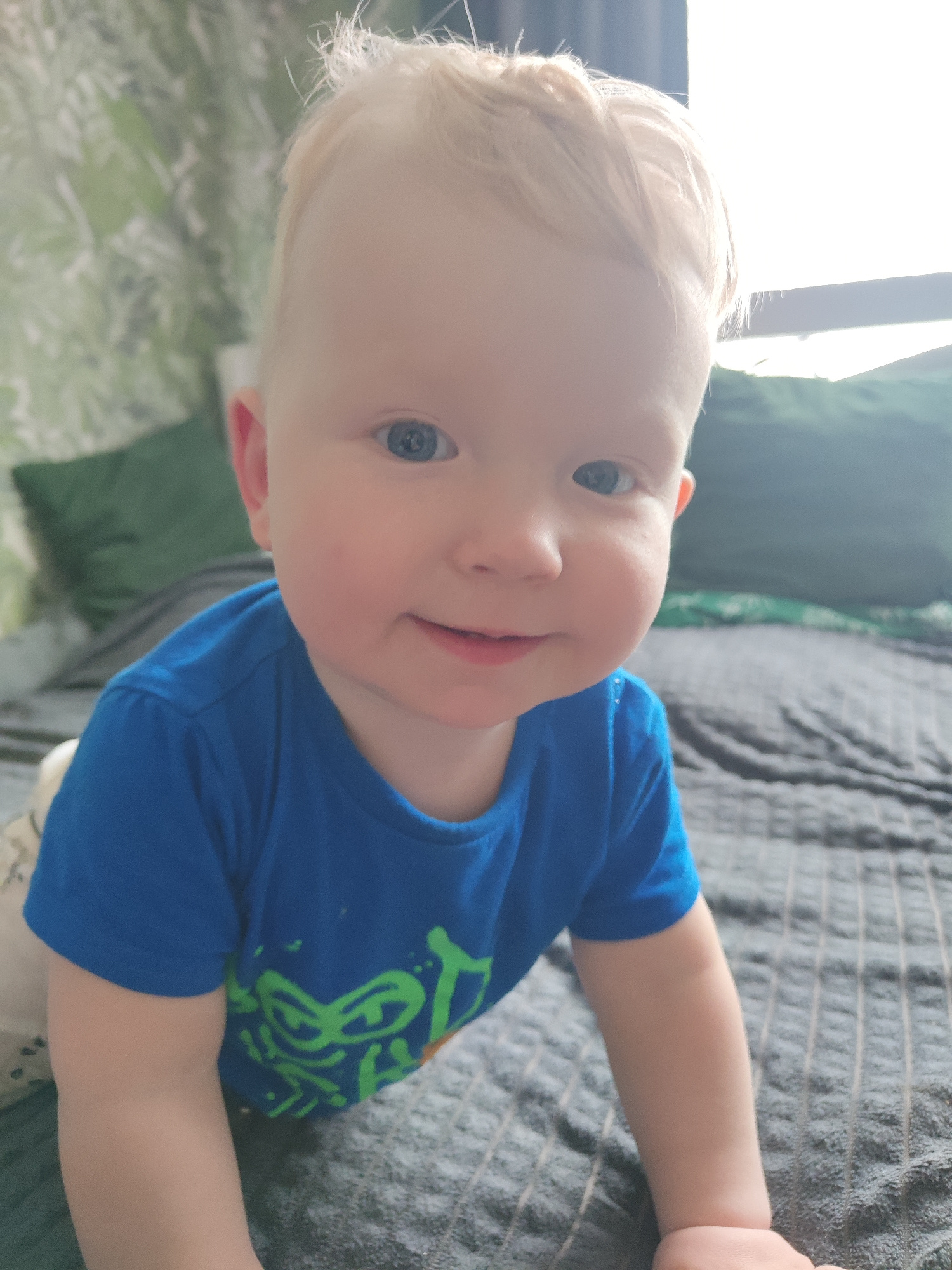A young child with blond hair and blue eyes is lying on their stomach on a gray textured blanket or bedspread. The child is wearing a blue t-shirt with a green graphic design. Behind the child, there…read more