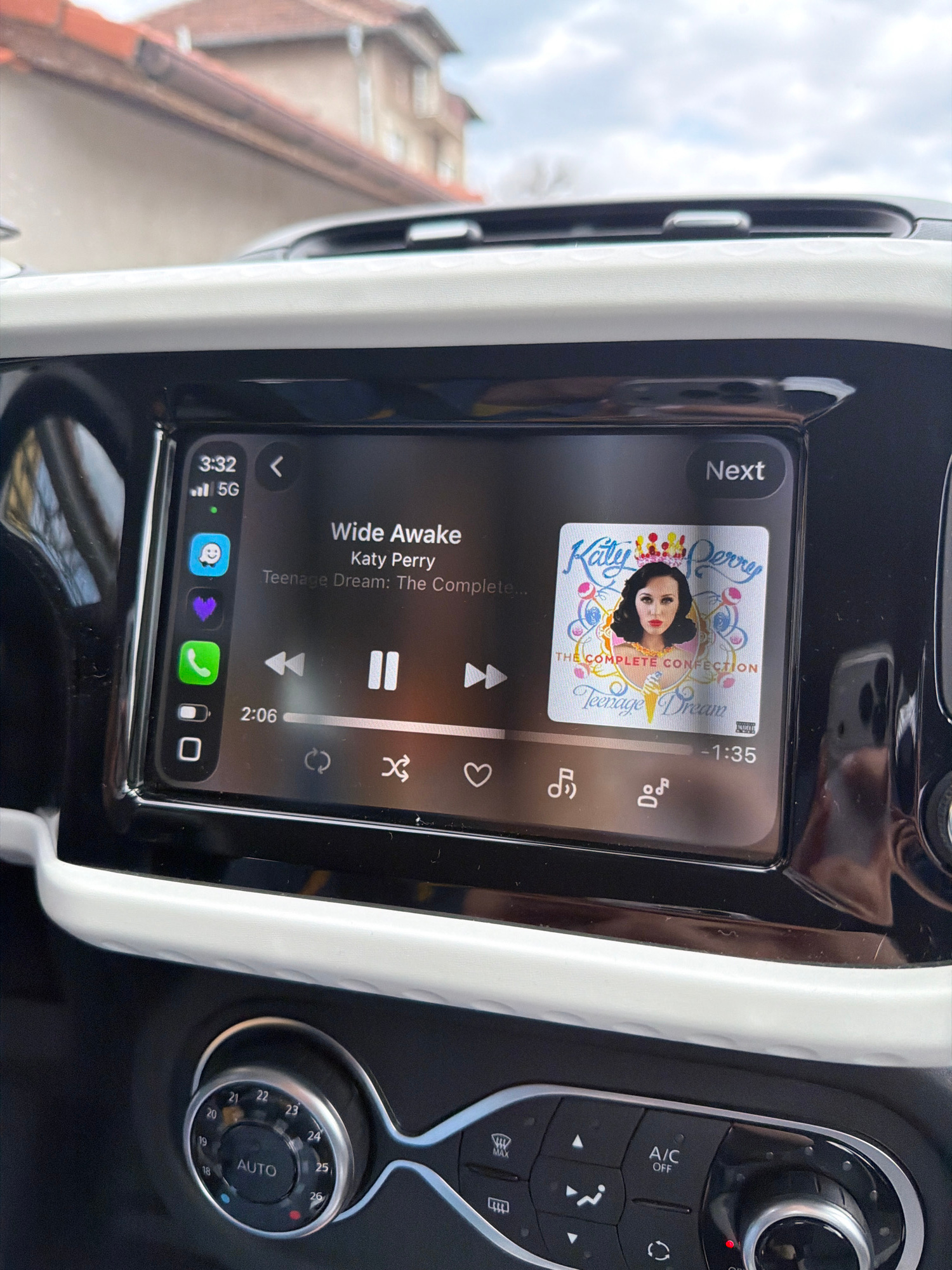 The image shows the in-car entertainment system of a vehicle. The system displays the song "Wide Awake" by Katy Perry from the album "Teenage Dream: The Complete Confection." The track is at the 2:06…read more