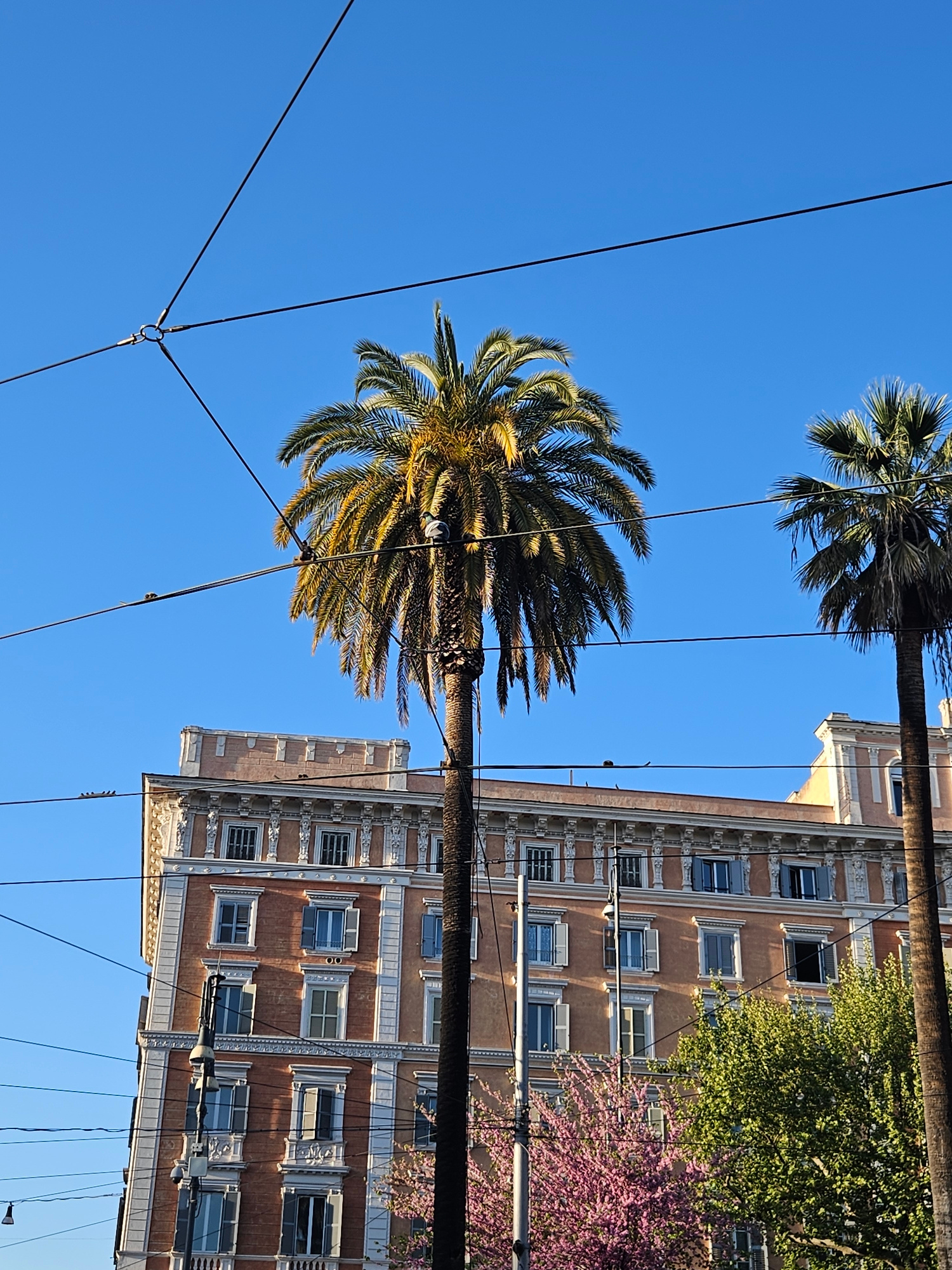 An upward-angle shot captures a blend of urban and natural elements against a clear blue sky. In the foreground, power lines intersect, creating a geometric pattern against the backdrop. Palm trees st…read more