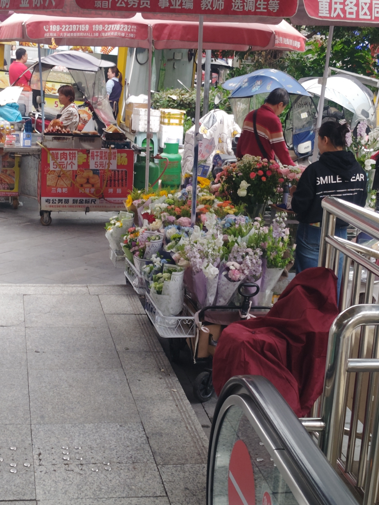 The image shows a street scene in Chongqing High-tech Zone, China, with a flower stall, food carts, and people. The stall is filled with bouquets of various flowers in paper wrapping. Two people appea…read more
