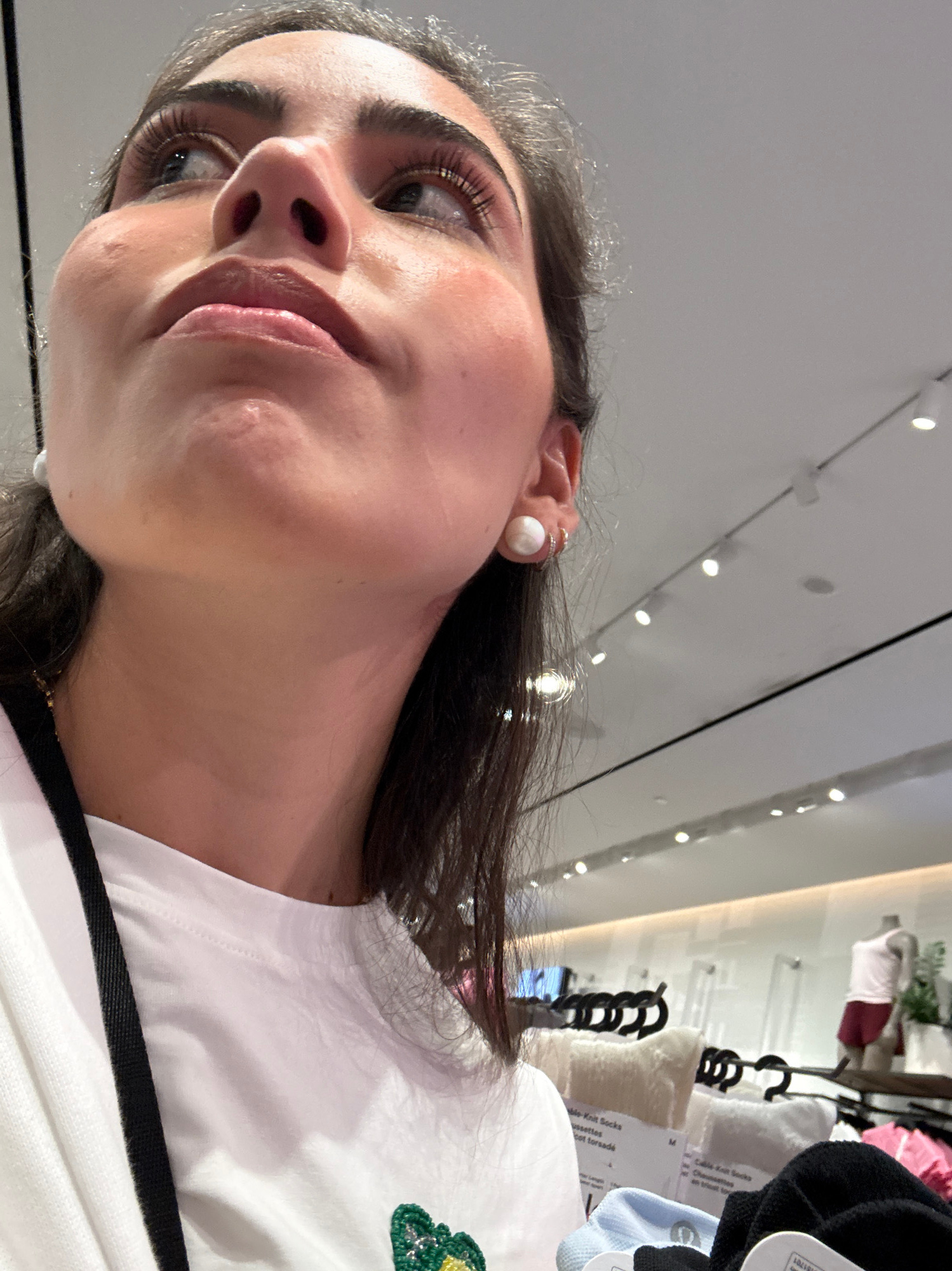 A woman with dark hair and fair skin is looking up towards the camera. She is wearing a white top with a black stripe, and pearl earrings. In the background, socks and clothing on hangers are visible,…read more