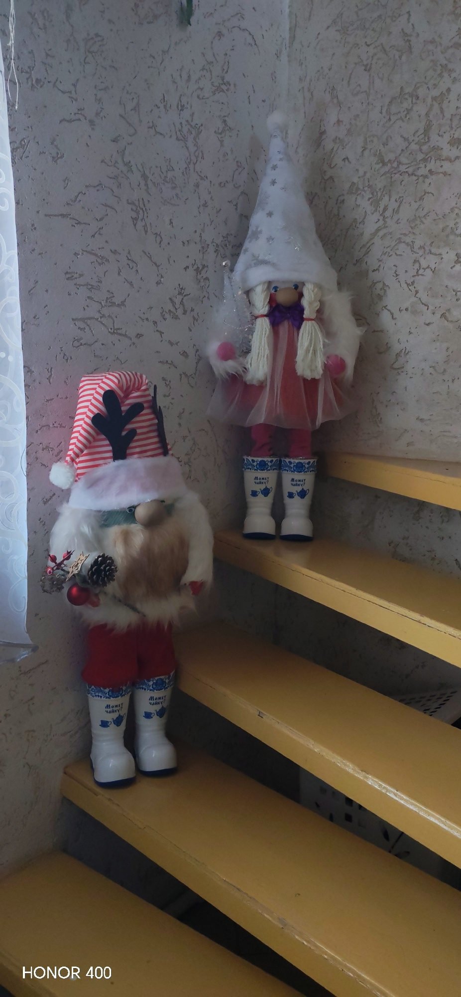 The image shows two Christmas gnome dolls positioned on wooden stairs. The gnome on the left wears a striped hat with reindeer antlers, a white beard, and red shorts, holding a decorative pine cone anβ¦read more