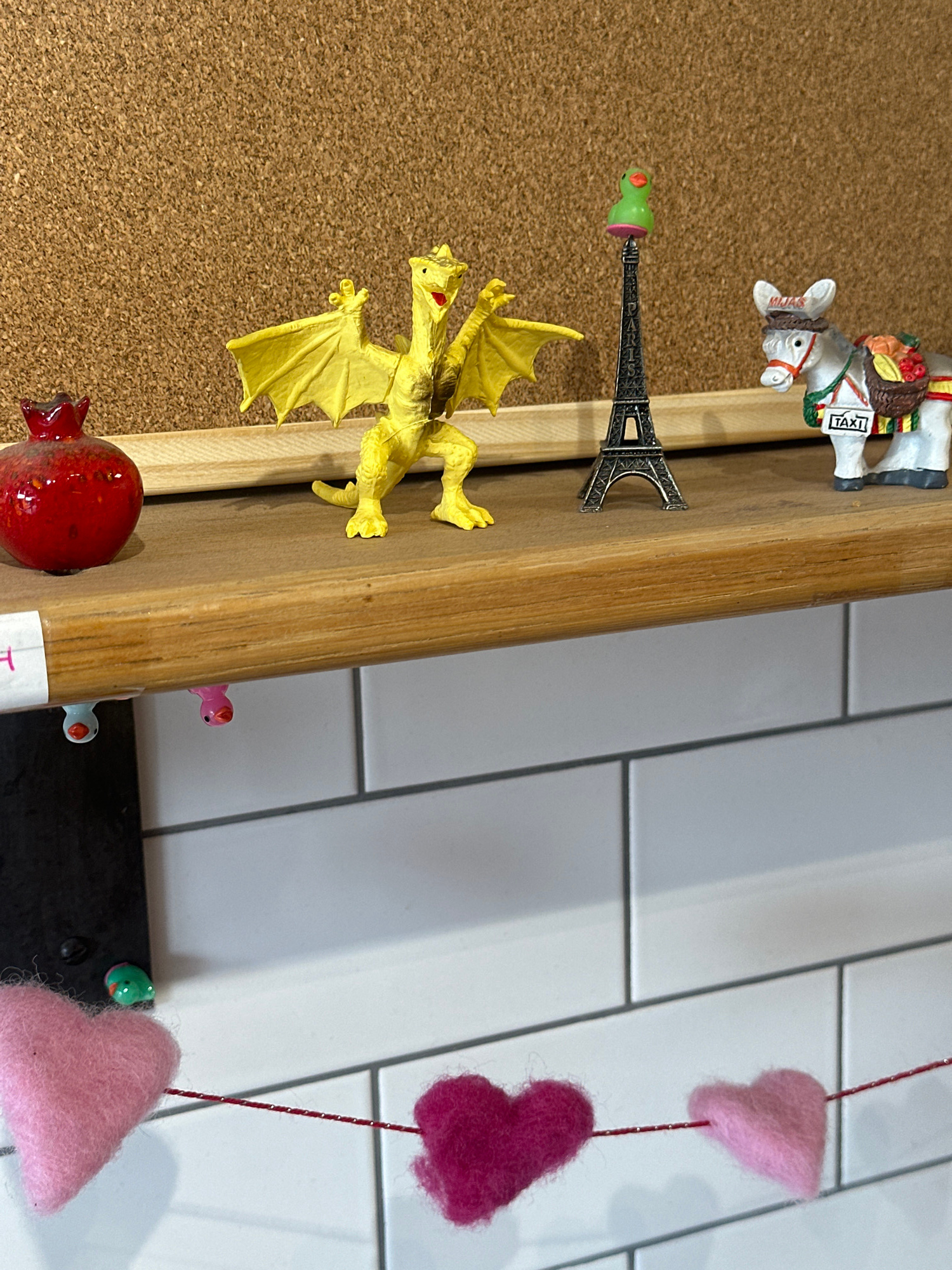The image shows a variety of small objects attached to the side of a wooden frame. These objects include a white donkey figurine with "TAXI" written on it, a miniature Eiffel Tower, a yellow dragon to…read more
