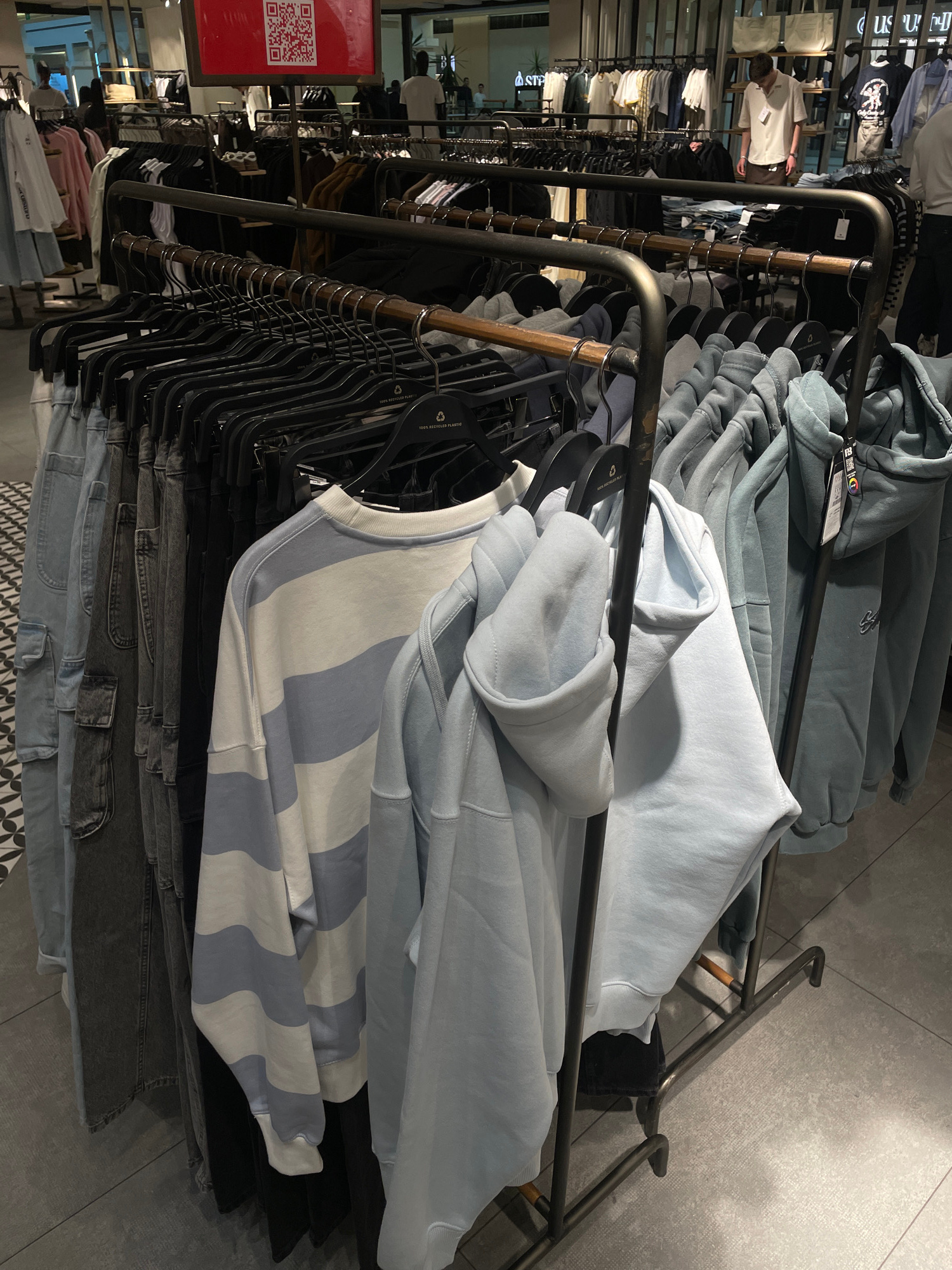 The image shows a clothing rack inside what appears to be a retail store. The rack is filled with folded hoodies and jeans, primarily in shades of blue and grey. The clothing is hung on black plasticβ¦read more
