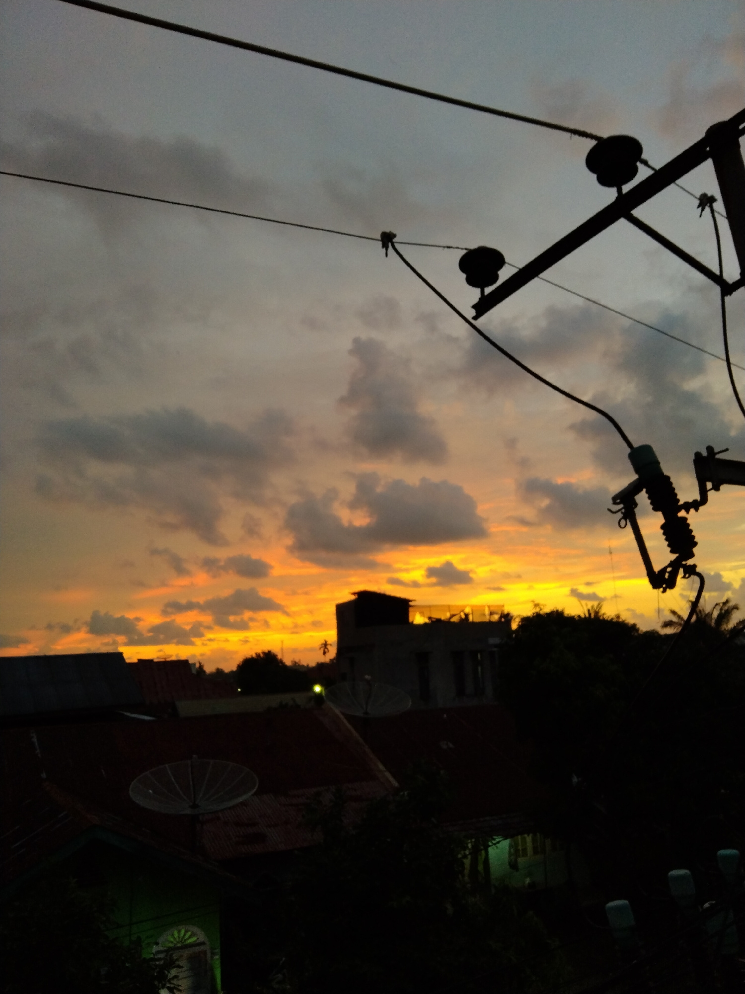The image captures a vibrant sunset over a residential area in Bireuenmeunasahdayah, Indonesia. The sky dominates the upper and mid-sections, displaying a dramatic gradient of colors. At the top, theβ¦read more
