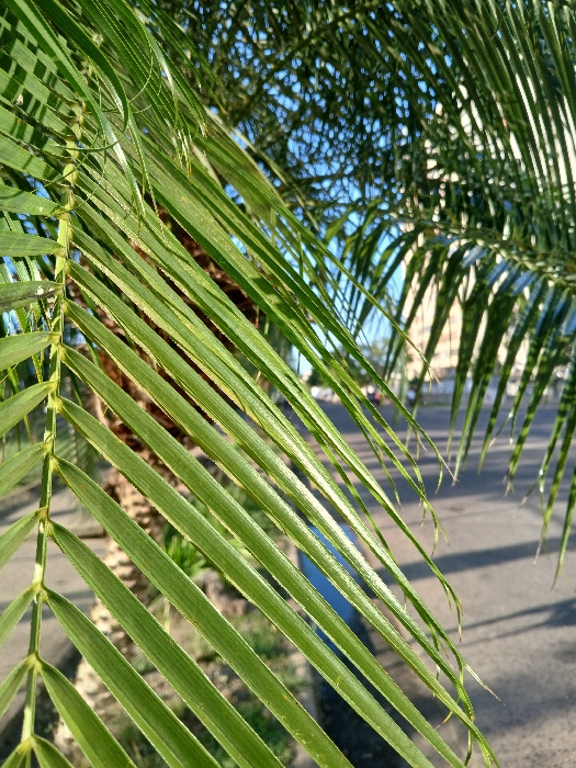 The image captures a close-up of green palm fronds, their linear segments stretching across the frame. Sunlight highlights the texture of each leaf, casting shadows and emphasizing their shape. In the…read more