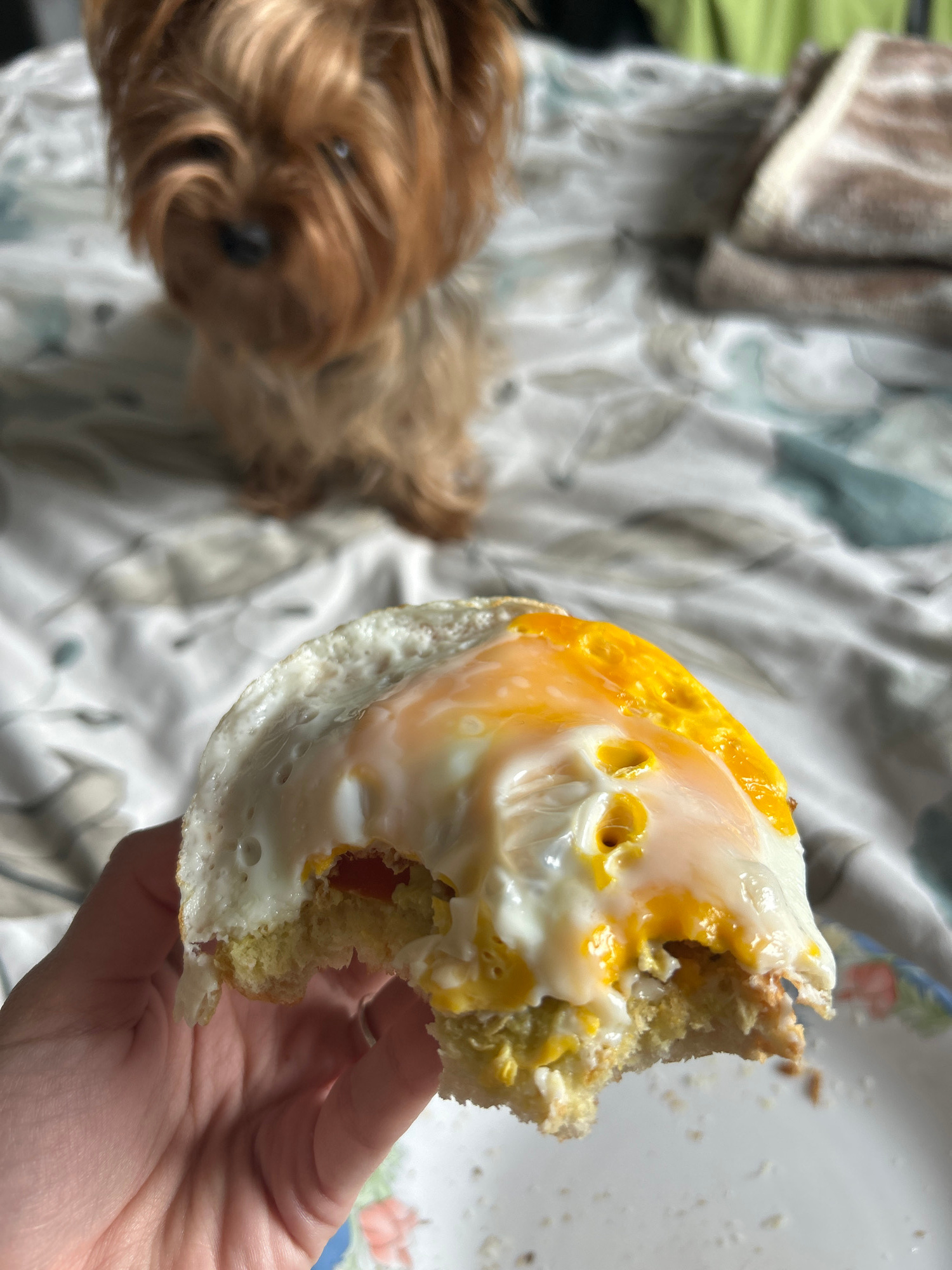 A hand holds a piece of bread topped with a fried egg. The egg's yolk is runny, with small holes appearing on the surface. A plate is partially visible in the background, with floral patterns on it. I…read more