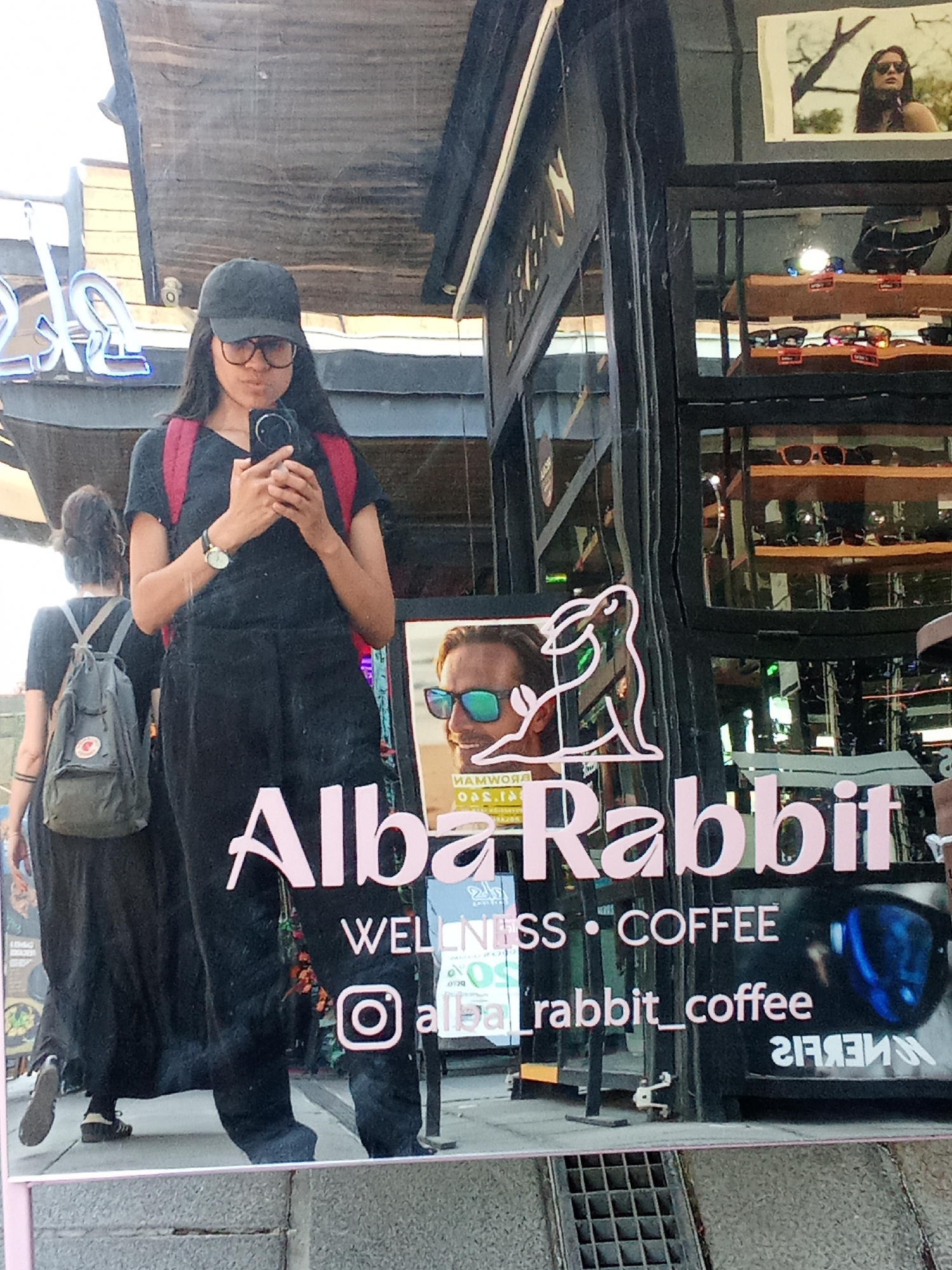 The photograph is a street-level, mirrored view of a woman in a black cap and black clothes holding a cellphone, likely taking a selfie in front of a business named "Alba Rabbit: Wellness * Coffee" lo…read more