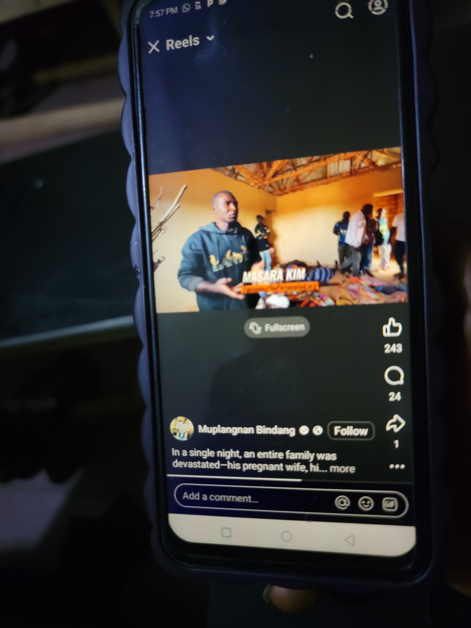 The image shows a smartphone screen displaying a social media reel, possibly on Instagram or TikTok. The reel features a man, identified as Muplangnan Bindang, and a scene of apparent devastation. Tex…read more