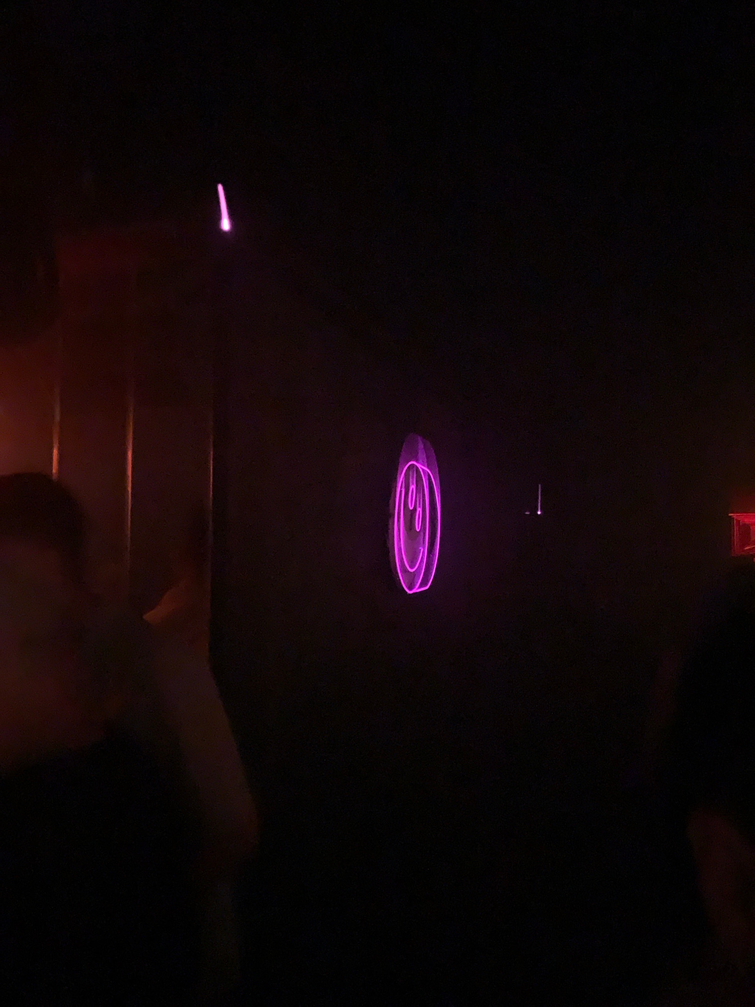 The image, taken in very low light, shows a ceiling with a faint outline of overhead structures and a series of glowing purple projections. The central projection is a series of concentric circles, an…read more