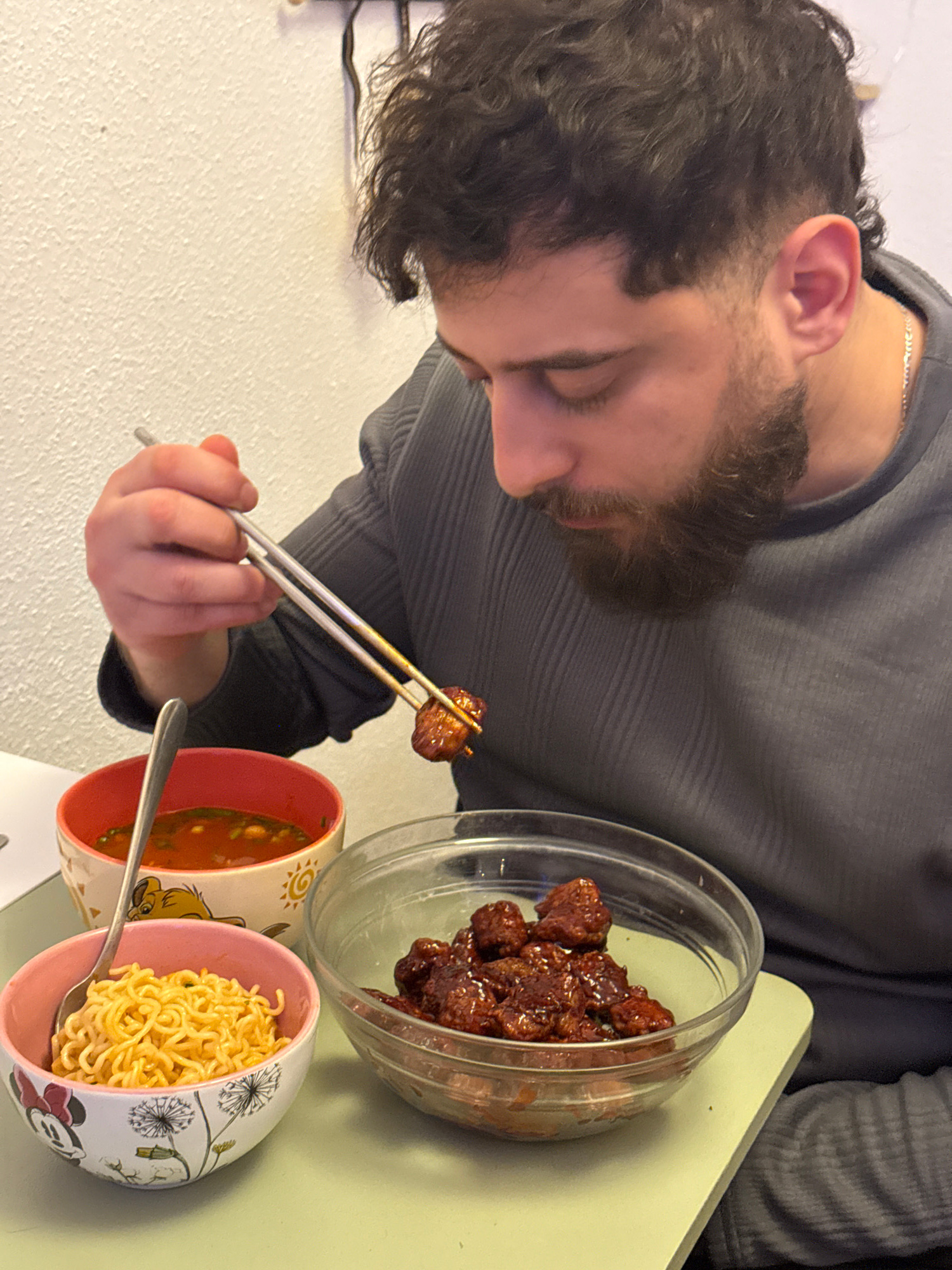 An adult male with dark, curly hair, a faded haircut, and a full beard is depicted seated indoors in Strasbourg, France, consuming a meal. He wears a ribbed, dark grey long-sleeved shirt and a silverβ¦read more