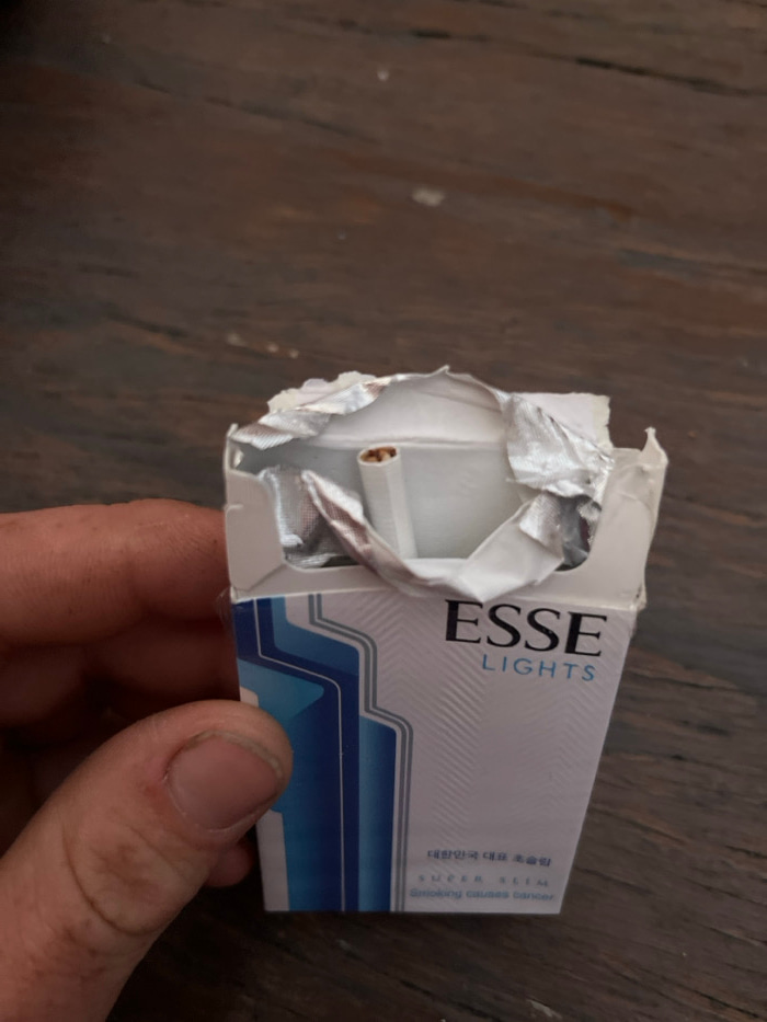 A light-skinned human hand, exhibiting visible knuckles and fingernails, firmly grasps an open pack of Esse Lights Super Slim cigarettes. The cigarette pack is predominantly white with blue geometric…read more