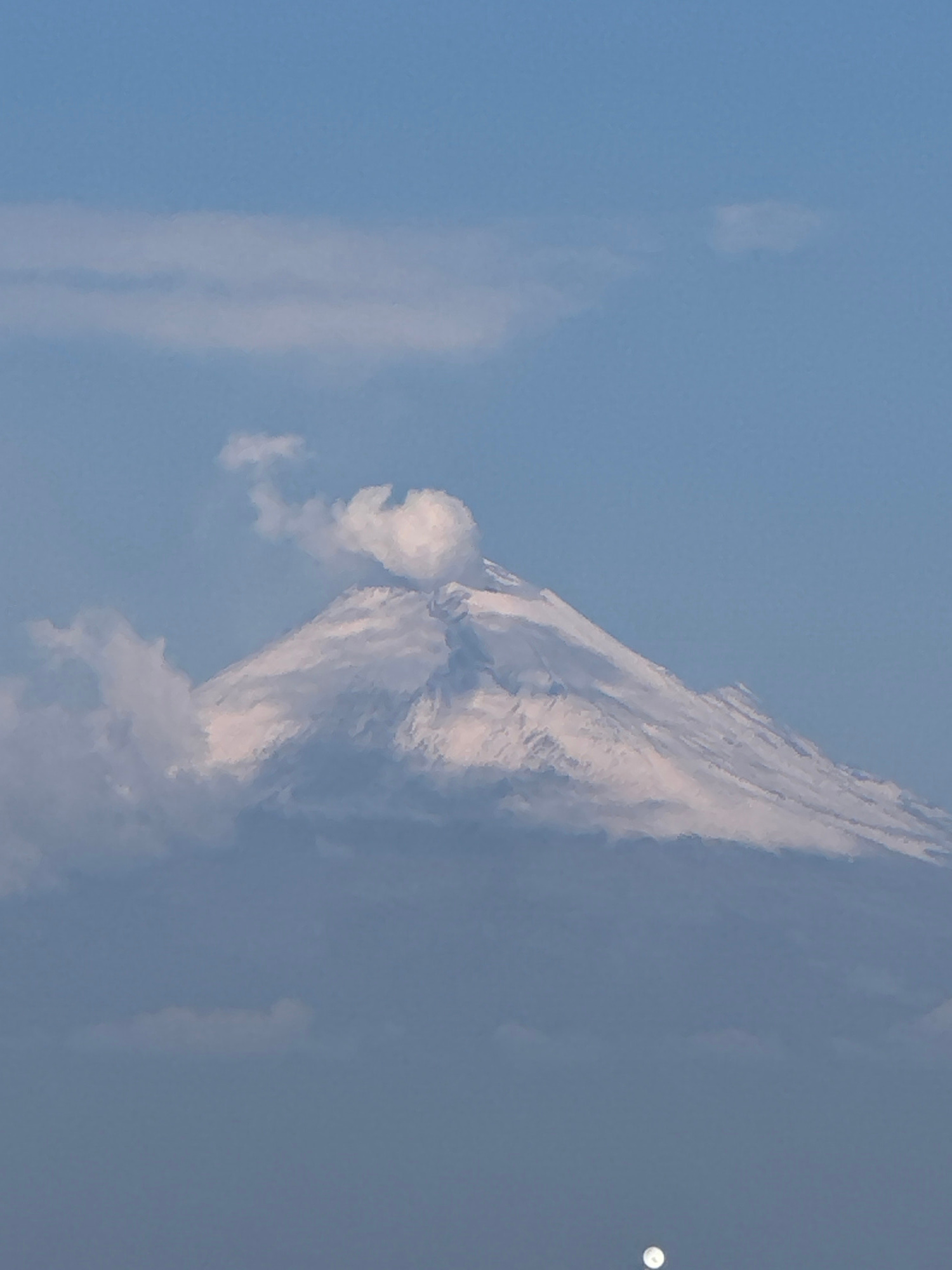 The image depicts a bright blue sky with a few scattered clouds. The main subject is a large, white cloud formation in the center-right portion of the image, resembling a mountain with a somewhat defi…read more