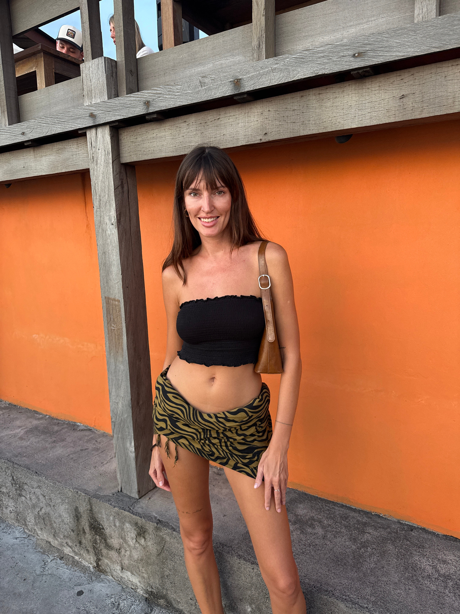 The image shows a woman standing in front of an orange wall, seemingly in North Kuta, Indonesia, based on the architectural details and general ambiance. She is wearing a black strapless top and a patβ¦read more