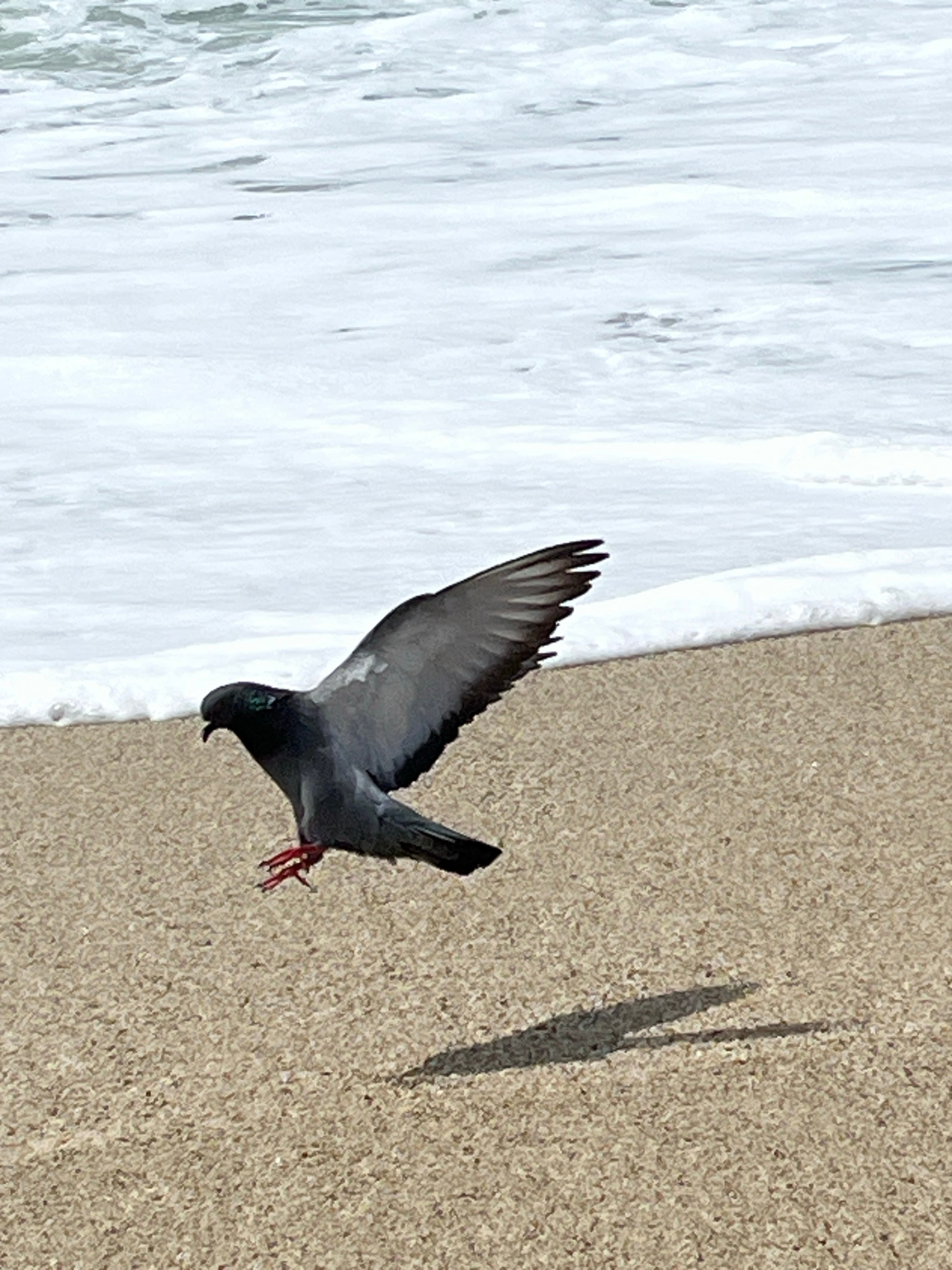 A pigeon is flying near a beach in Alanya, Turkey. The pigeon is in mid-flight with its wings partially extended and its feet dangling. The background shows the edge of the sea with white foamy waves…read more