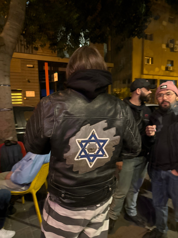 The image depicts an outdoor urban scene at night in Tel-Aviv, Israel, illuminated by artificial light. The primary subject, viewed from behind, is an individual with medium-length brown hair wearing…read more