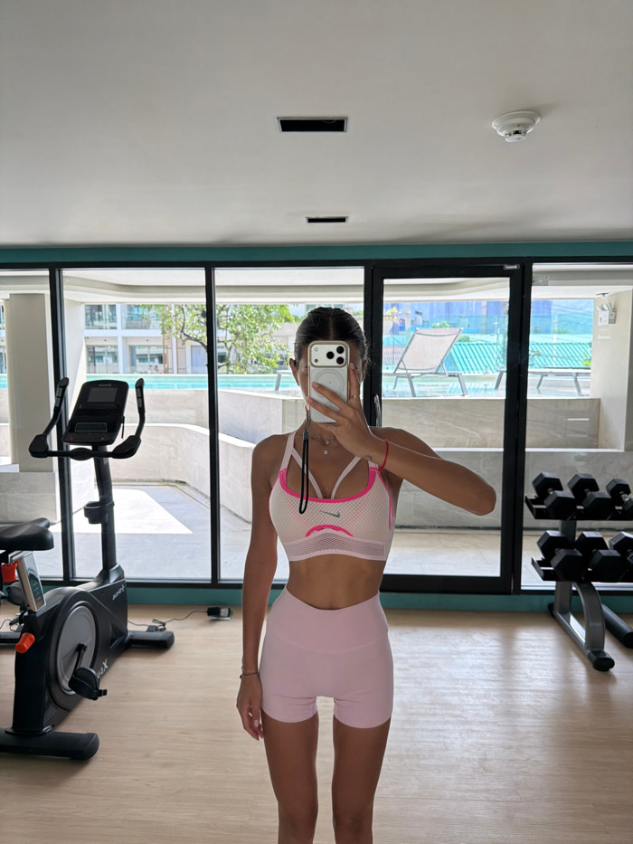 A slender woman in a pink sports bra and matching shorts poses for a mirror selfie in a gym. Behind her, a window reveals an outdoor view. Exercise equipment, including an exercise bike and dumbbell r…read more