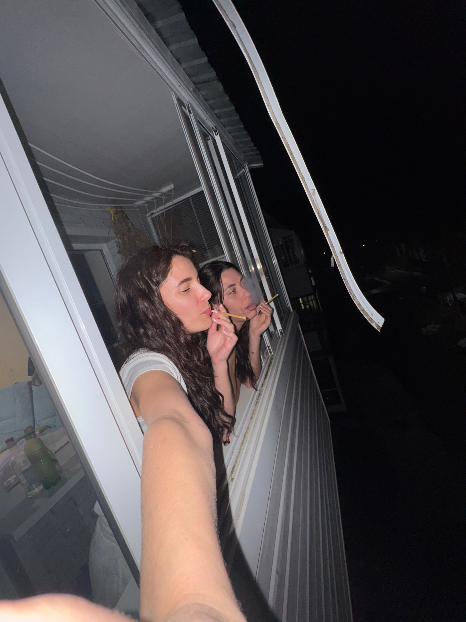 Two young women are visible in a mirror frame. They are holding lit smoking devices. Smoke is being exhaled by the woman on top. The background shows what appears to be a roof and the night sky. Some…read more