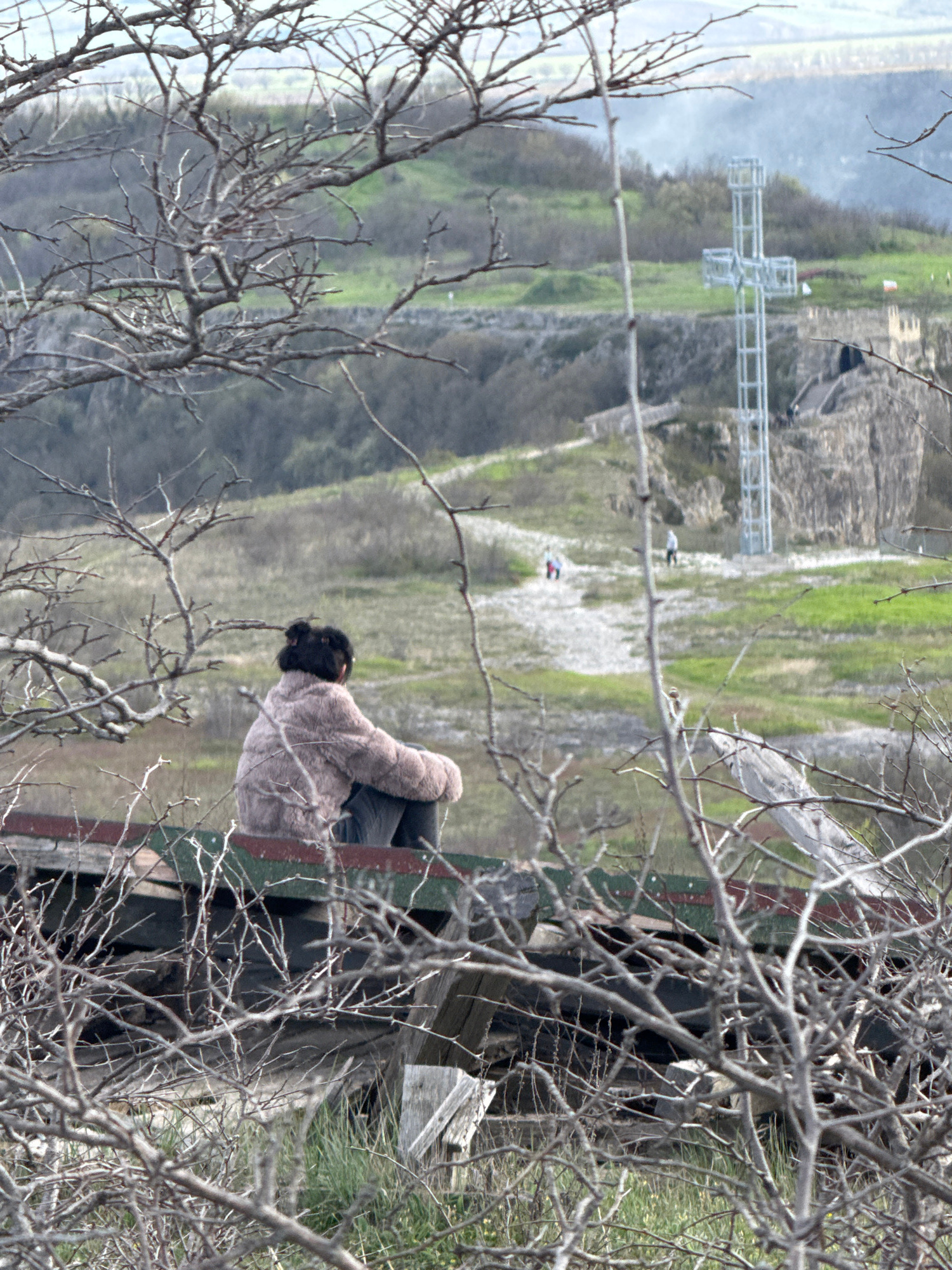 A sideways, eye-level shot shows a woman sitting in the ruins of an old wooden structure, likely a building, on a hill overlooking a town and countryside. The woman is viewed from the side and behind,…read more