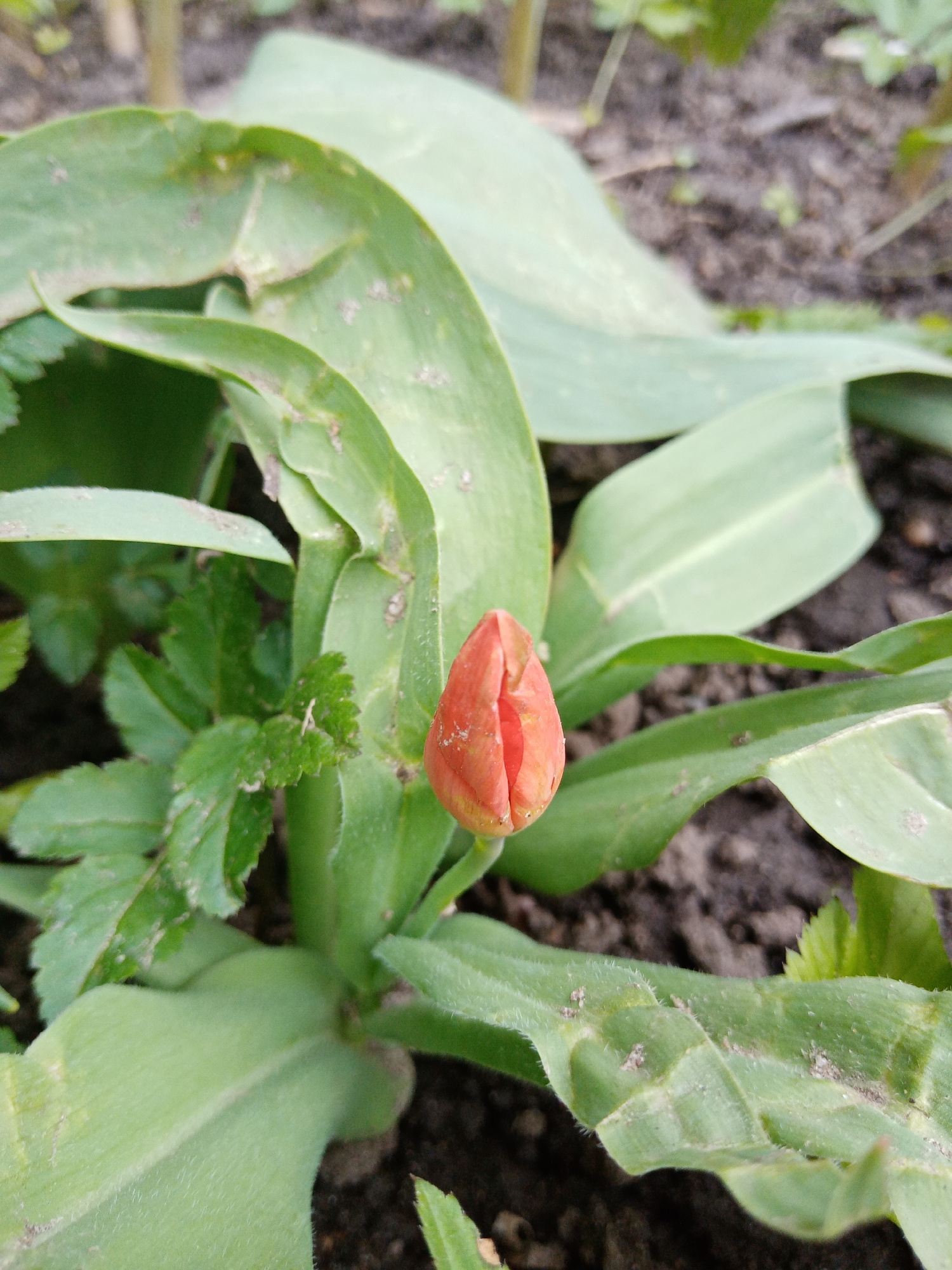 The image shows a close-up of a red tulip bud surrounded by green leaves in a garden. The soil is visible in the background. There's no information present to confirm the location or any information a…read more