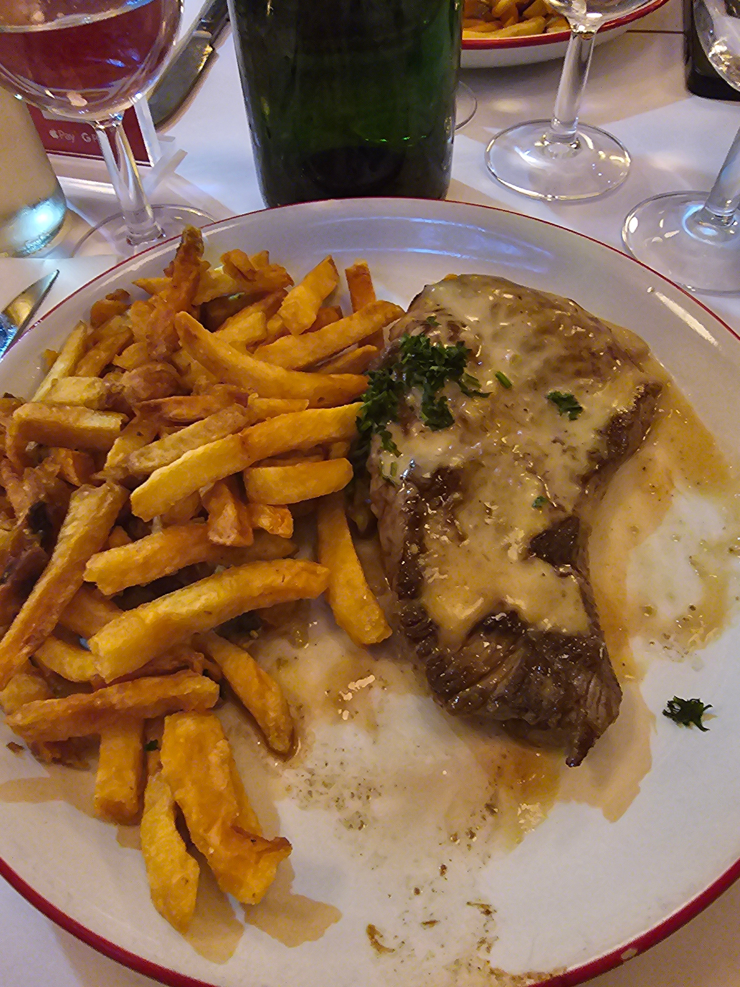 The image shows a partially eaten meal of steak with a white sauce and french fries on a white plate with a red rim, likely in a restaurant in Paris, France. A green bottle and several wine glasses ar…read more