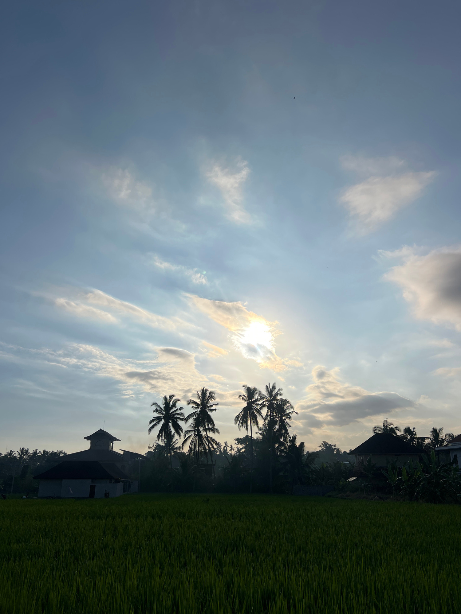 This media file captures a serene, sunlit landscape in Tampaksiring, Indonesia. The dominant feature is the sky, a blend of clear blue and scattered clouds. The sun, partially obscured by clouds, shinβ¦read more