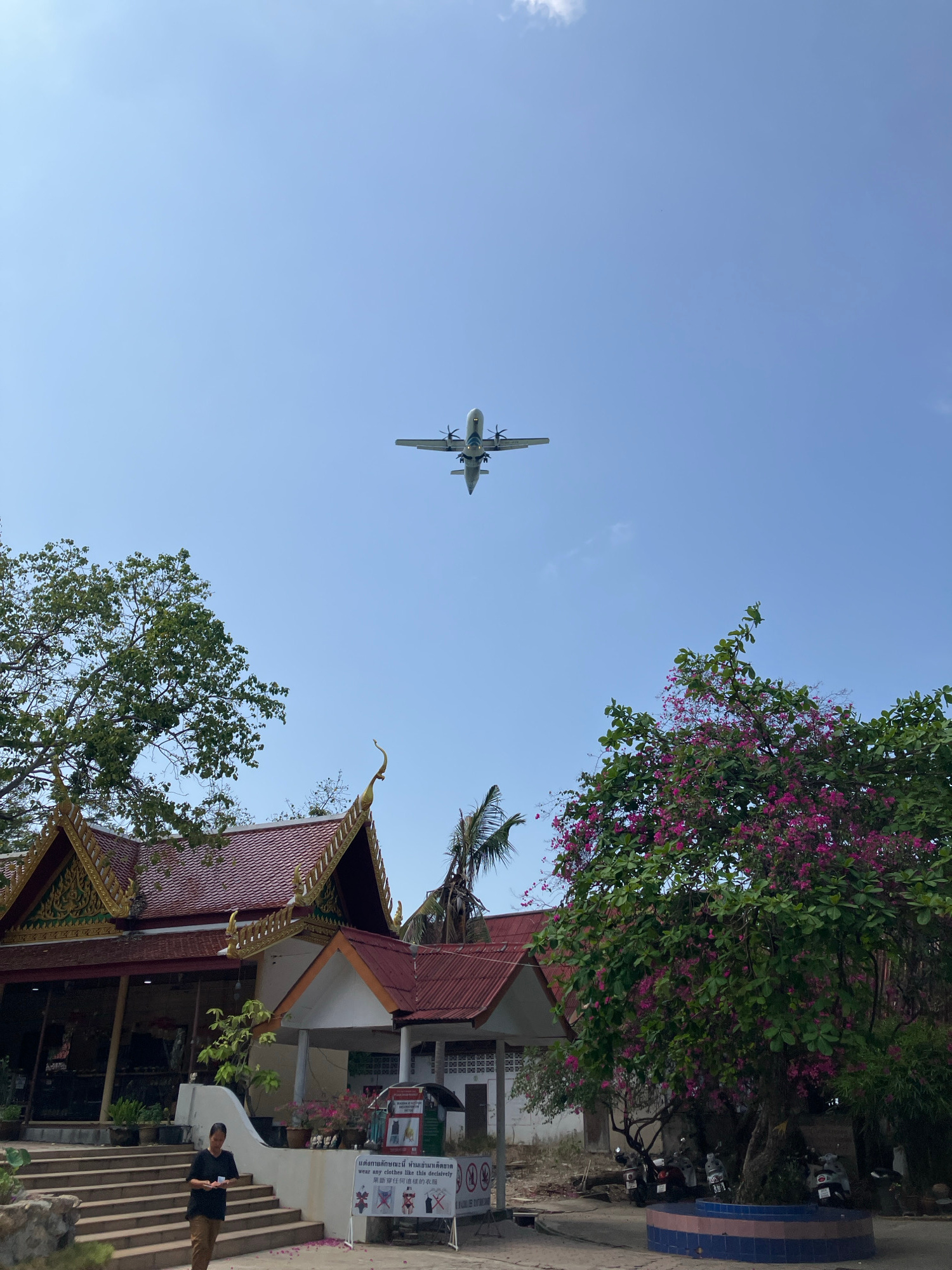 An upward-angled shot captures a clear blue sky, where a turboprop airplane with four visible engines and propellers flies across the upper-left quadrant. Below, on the right, a traditional Thai-style…read more