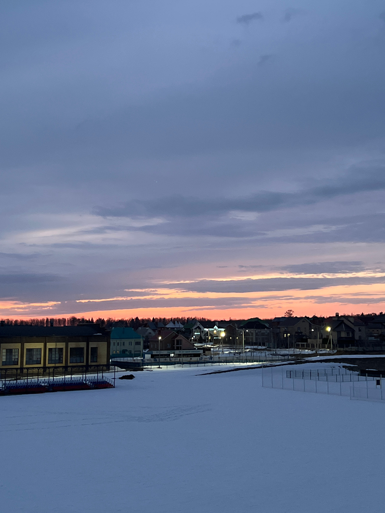 The image depicts a winter evening in Noviy, Russia. The foreground is covered in snow, suggesting a frozen river or lake. A stadium with seating is visible along the shoreline, with adjacent buildingβ¦read more