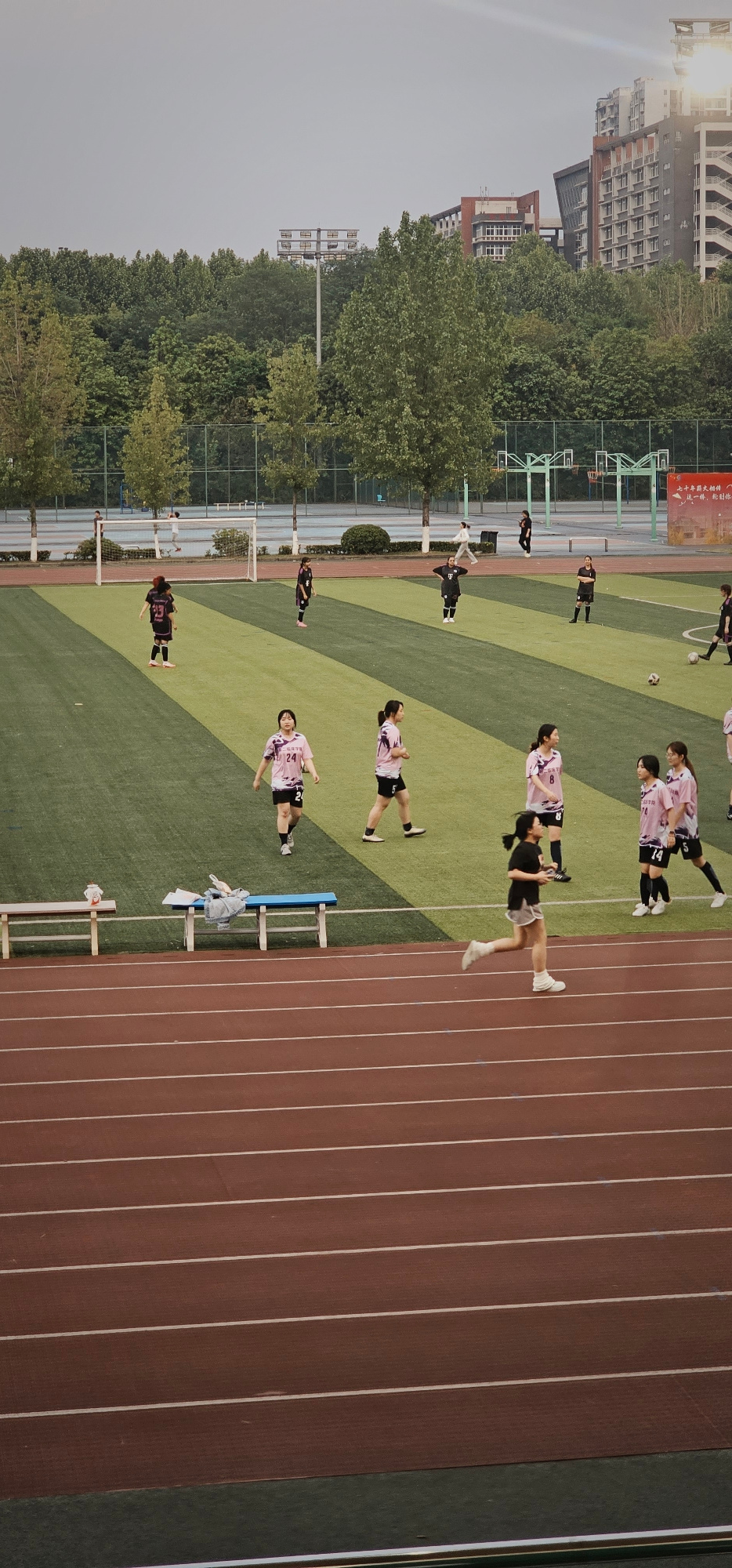 This image depicts an outdoor sports complex, likely located in Chongqing High-tech Zone, China. The scene is illuminated by bright daylight, with a noticeable sun glare in the top left, suggesting ei…read more