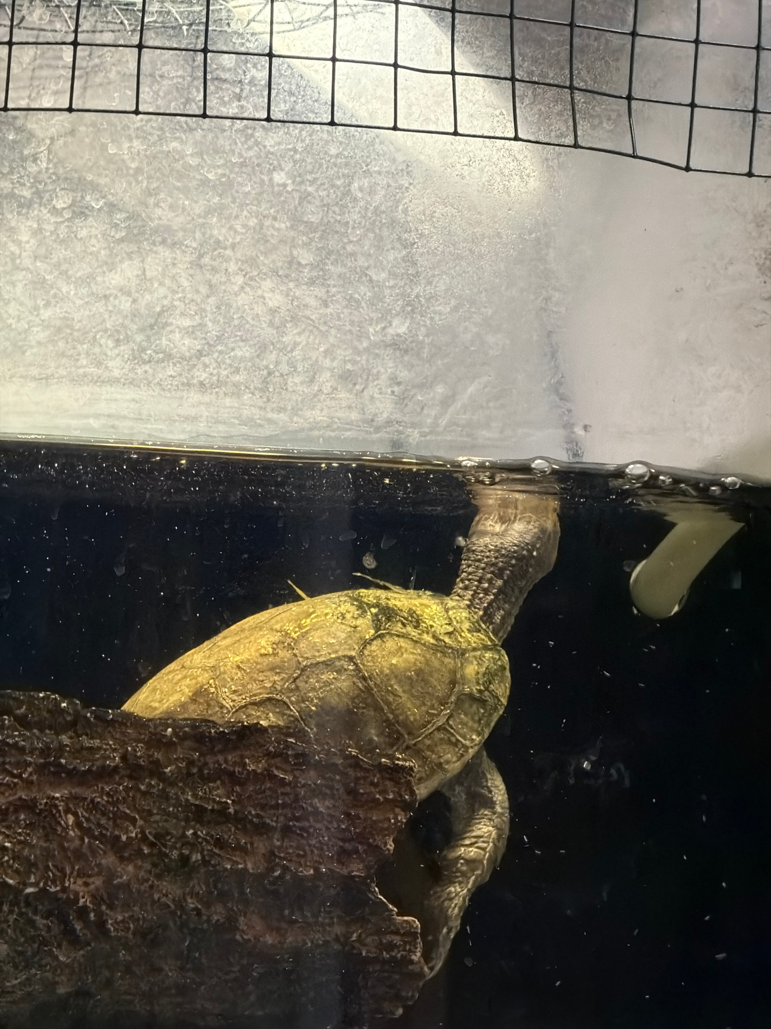 This close-up image captures a turtle partially submerged in an aquarium, seemingly reaching towards the water's surface. The turtle, positioned on the right side of the frame, has a textured, yellowi…read more