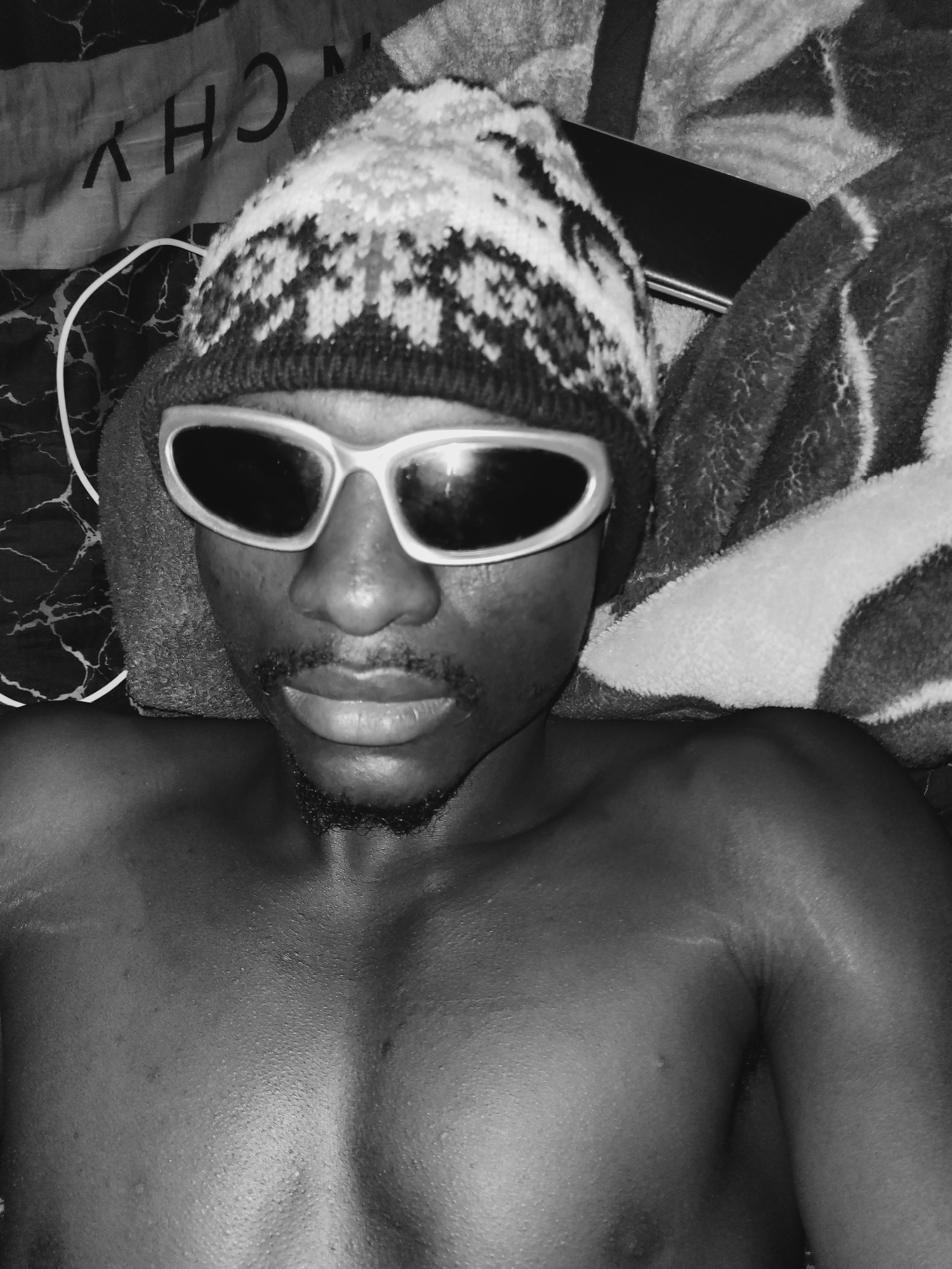 A black and white, tilted, close-up shot shows a man lying down with a knitted hat and sunglasses, partially shirtless, on what appears to be a patterned fabric or bed. A dark rectangular object, poss…read more