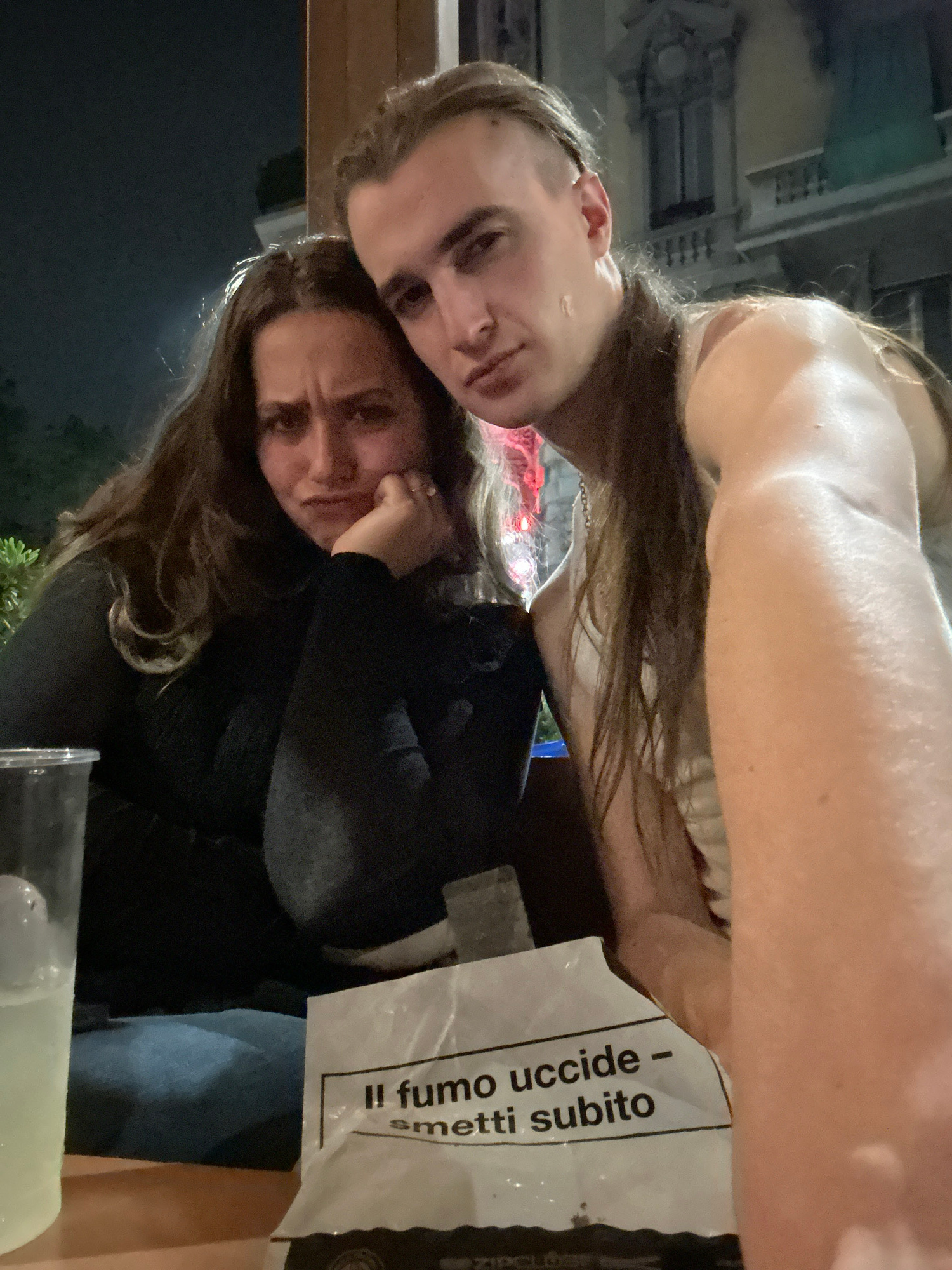 Two light-skinned individuals are posing for a photo. The first individual is on the left, with dark hair and light eyes. The second individual is directly below the first and has brown hair and brown…read more