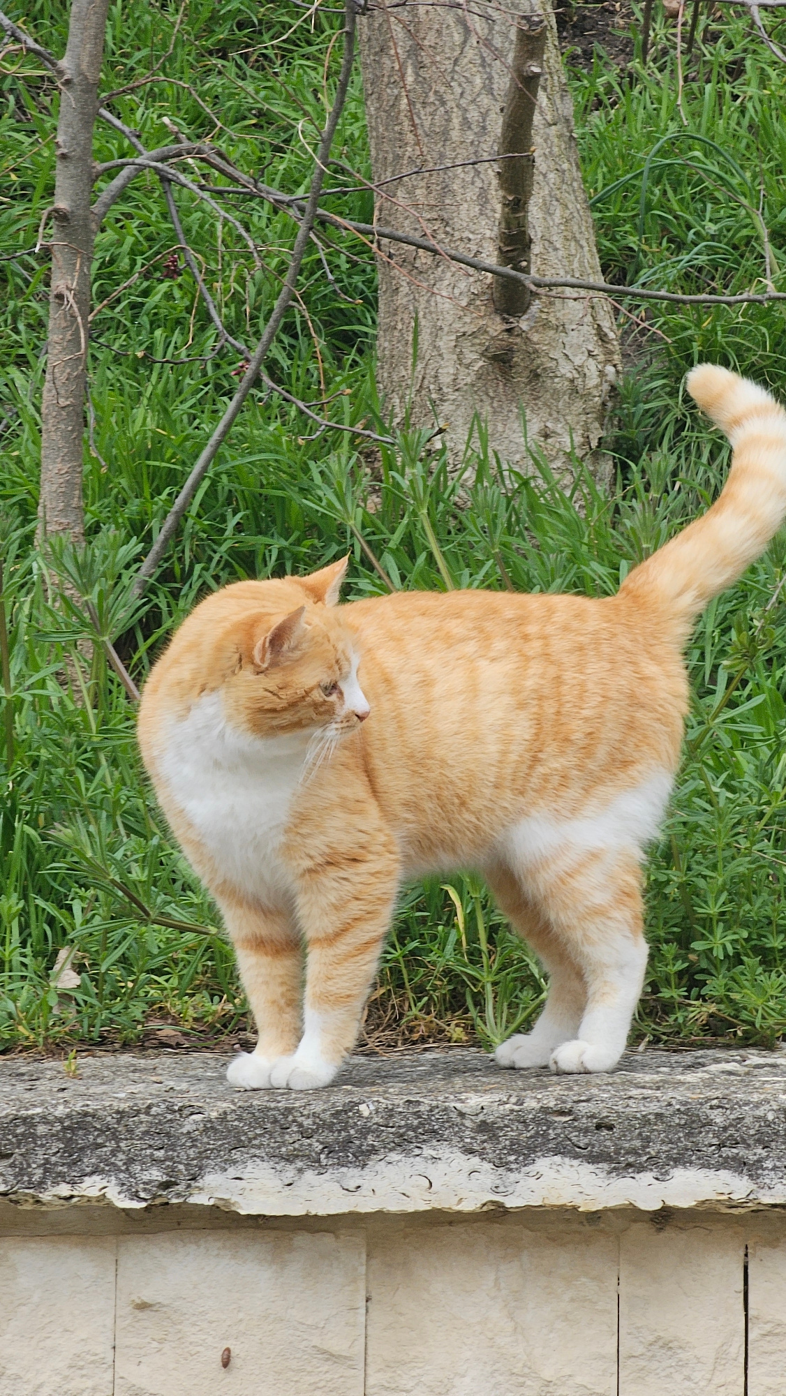 An orange and white tabby cat is standing on a stone ledge in a grassy area. The cat is positioned near a tree trunk and a wall of light-colored stone. The scene appears to be outdoors, possibly in Va…read more